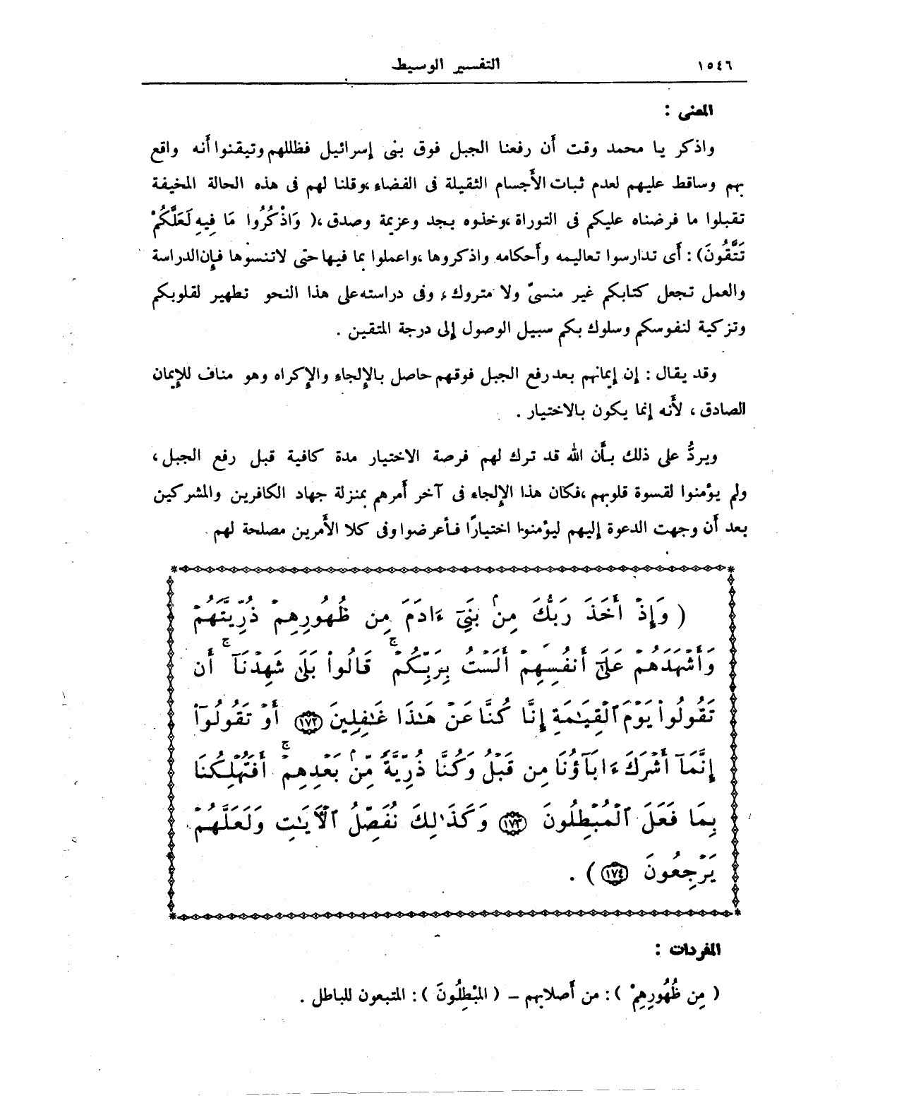 {وَإِذْ أَخَذَ رَبُّكَ مِنْ بَنِي آدَمَ مِنْ ظُهُورِهِمْ ذُرِّيَّتَهُمْ وَأَشْهَدَهُمْ عَلَى أَنْفُسِهِمْ أَلَسْتُ بِرَبِّكُمْ قَالُوا بَلَى شَهِدْنَا أَنْ تَقُولُوا يَوْمَ الْقِيَامَةِ إِنَّا كُنَّا عَنْ هَذَا غَافِلِينَ (172) أَوْ تَقُولُوا إِنَّمَا أَشْرَكَ آبَاؤُنَا مِنْ قَبْلُ وَكُنَّا ذُرِّيَّةً مِنْ بَعْدِهِمْ أَفَتُهْلِكُنَا بِمَا فَعَلَ الْمُبْطِلُونَ (173) وَكَذَلِكَ نُفَصِّلُ الْآيَاتِ وَلَعَلَّهُمْ يَرْجِعُونَ (174)}.