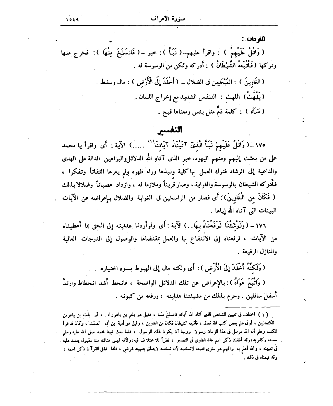 (¬1) اختلف في تعيين الشخص الذي آتاه الله آياته فانسلخ منها، فقيل هو بلعم بن باعوراء, أو بلعام بن ياعر من الكنعانيين, أوتى علم بعض كتب الله تعالى, فأتبعه الشيطان فكان من الغاوين، وقيل هو أمية بن أبي الصلت، وكان قد قرأ الكتب وعلم أن الله مرسل في هذا الزمان رسولًا ورجا أن يكون ذلك الرسول، فلما بعث نبينا محمَّد - صلى الله عليه وسلم - حسده وكفر به، وقد أغفلنا ذكر اسم هذا الغاوى في التفسير، نظرًا للاختلاف فيه، ولأنه ليس هناك سند مقبول يعتمد عليه. في تعيينه، والله أعلم به والمهم هو مغزى قصته لا شخصه لأن شخصه لا يتعلق بتعيينه غرض، فلذا غفل القرآن ذكر اسمه، وقد تبعناه في ذلك.