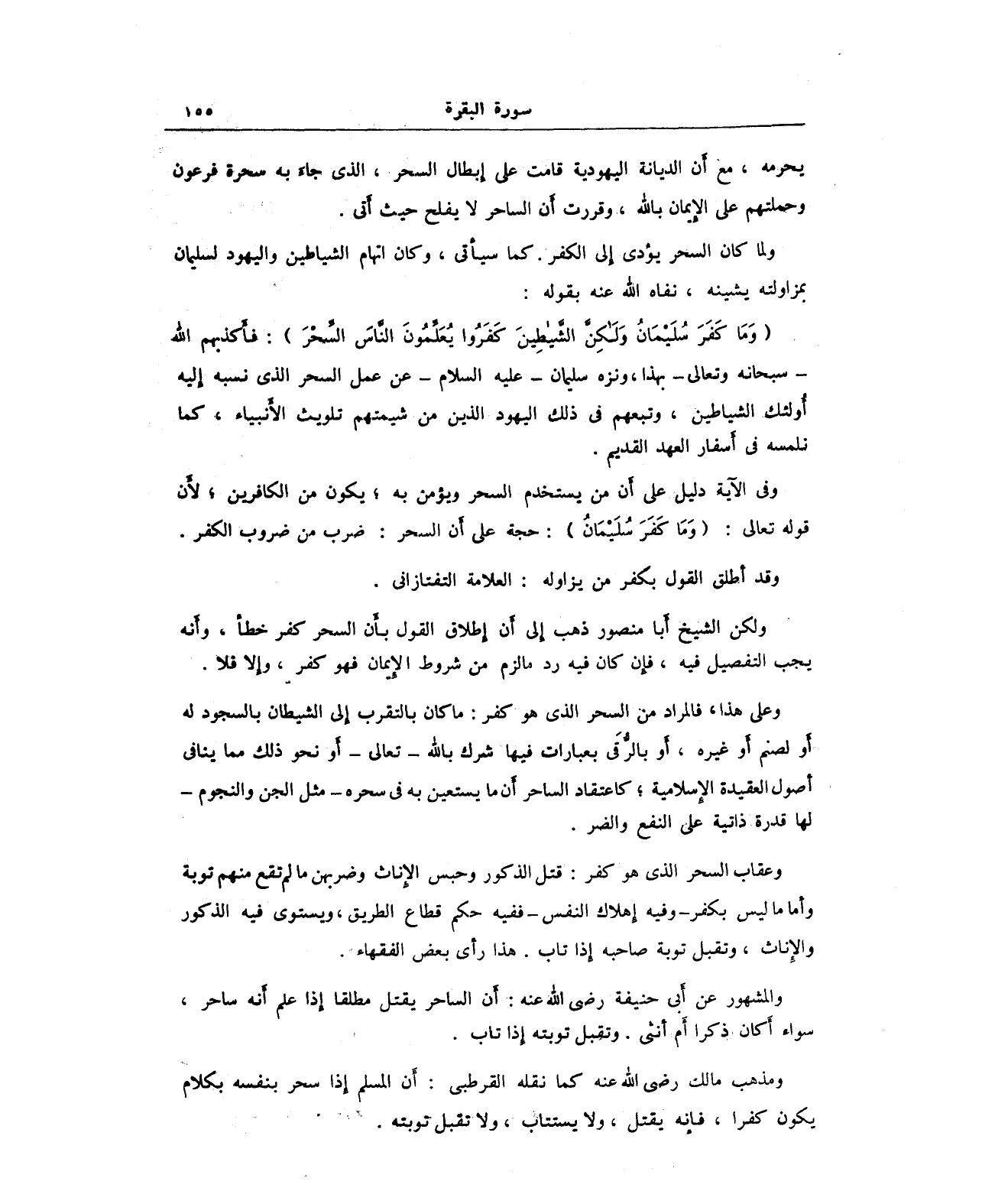 ولما كان السحر يؤدي إلى الكفر. كما سيأتى، وكان اتهام الشياطين واليهود لسليمان بمزاولته يشينه، نفاه الله عنه بقوله: {وَمَا كَفَرَ سُلَيْمَانُ وَلَكِنَّ الشَّيَاطِينَ كَفَرُوا يُعَلِّمُونَ النَّاسَ السِّحْرَ}: فأكذبهم الله -سبحانه وتعالى- بهذا، ونزه سليمان - عليه السلام - عن عمل السحر الذي نسبه إليه أُولئك الشياطين، وتبعهم في ذلك اليهود الذين من شيمتهم تلويث الأنبياء, كما نلمسه في أسفار العهد القديم.