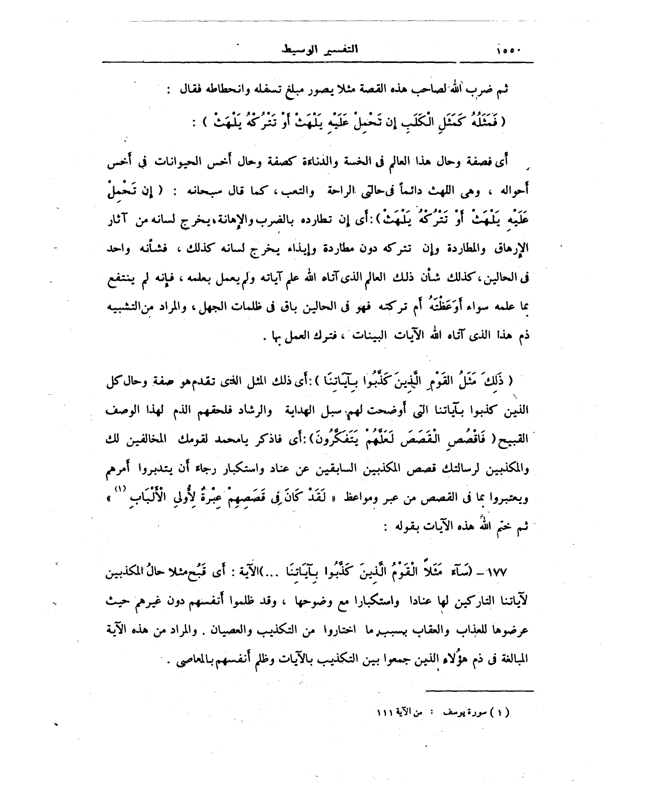 أَي فصفة وحال هذا العالم في الخسة والدناءَة كصفة وحال أَخس الحيوانات في أَخس أَحواله، وهي اللهث دائمًا في حالتى الراحة والتعب، كما قال سبحانه: {إِنْ تَحْمِلْ عَلَيْهِ يَلْهَثْ أَوْ تَتْرُكْهُ يَلْهَثْ}: أَي إِن تطارده بالضرب والإِهانة يخرج لسانه من آثار الإِرهاق والمطاردة وإِن تتركه دون مطاردة وإِيذاء يخرج لسانه كذلك، فشأَنه واحد في الحالين، كذلك شأن ذلك العالم الذي آتاه الله علم آياته ولم يعمل بعلمه، فإِنه لم ينتفع بما علمه سواء أَوَعَظْتَهُ أَم تركته فهو في الحالين باق في ظلمات الجهل، والمراد من التشبيه ذم هذا الذي آتاه الله الآيات البينات، فترك العمل بها.