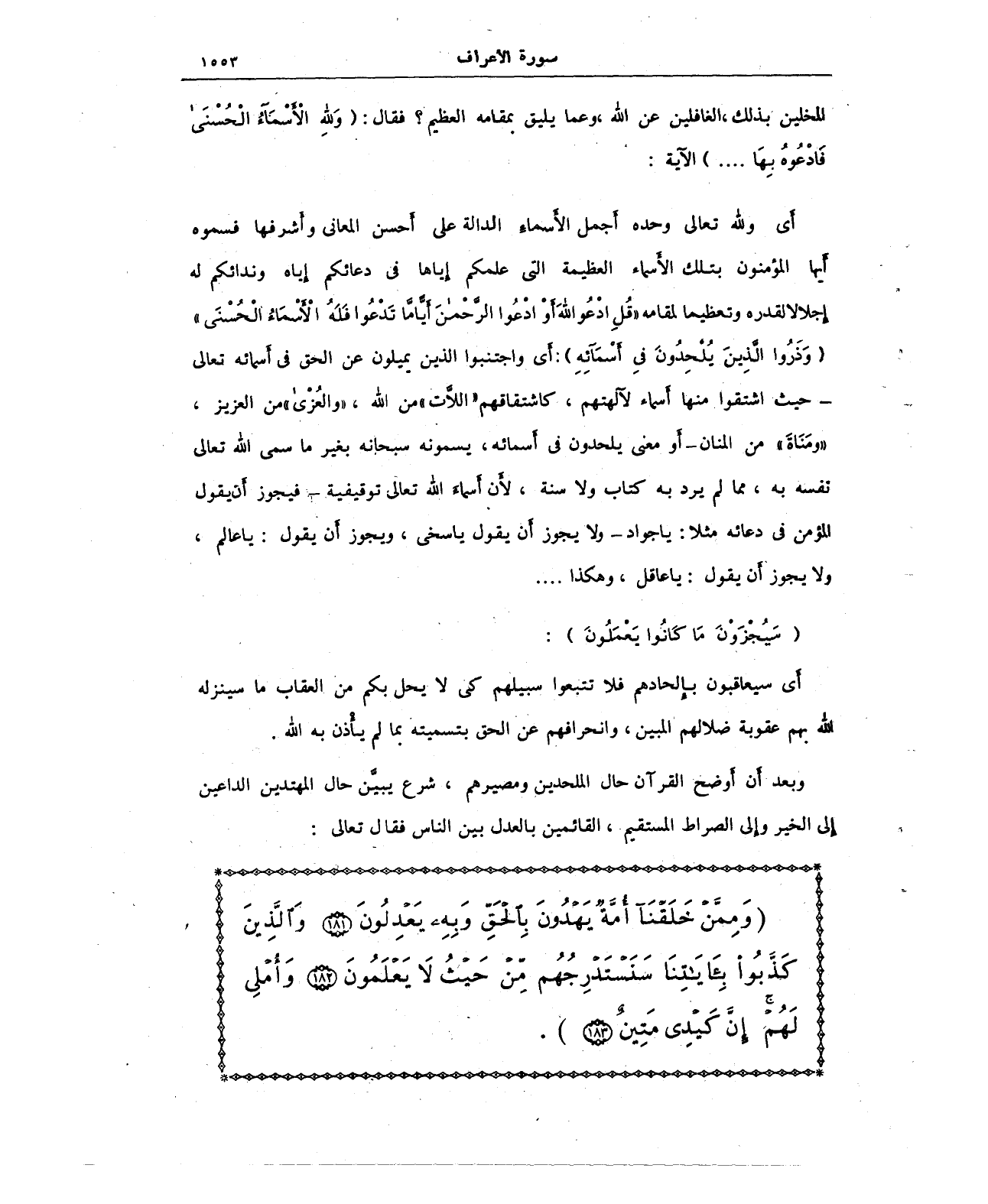 أَي ولله تعالى وحده أَجمل الأَسماءِ الدالة على أَحسن المعانى وأَشرفها فسموه أَيها المؤمنون بتلك الأَسماء العظيمة التي علمكم إِياها في دعائكم إِياه وندائكم له إِجلالا لقدره وتعظيما لمقامه {قُلِ ادْعُوا اللهَ أَوِ ادْعُوا الرَّحْمَنَ أَيًّا مَا تَدْعُوا فَلَهُ الْأَسْمَاءُ الْحُسْنَى} {وَذَرُوا الَّذِينَ يُلْحِدُونَ في أَسْمَائِهِ}: أَي واجتنبوا الذين يميلون عن الحق في أَسمائه تعالى - حيث اشتقوا منها أَسماء لآلهتهم، كاشتقاقهم "اللاَّت" من الله، "والعُزْى" من العزيز، "ومَنَاةَ" من المنان - أَو معنى يلحدون في أَسمائه، يسمونه سبحانه بغير ما سمى الله تعالى نفسه به، مما لم يرد به كتاب ولا سنة, لأَن أَسماءَ الله تعالى توقيفية - فيجوز أَن يقول المؤمن في دعائه مثلا: يا جواد - ولا يجوز أَن يقول يا سخى، ويجوز أَن يقول: يا عالم، ولا يجوز أَن يقول: يا عاقل، وهكذا ....