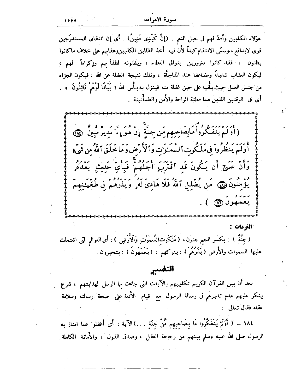 {أَوَلَمْ يَتَفَكَّرُوا مَا بِصَاحِبِهِمْ مِنْ جِنَّةٍ إِنْ هُوَ إِلَّا نَذِيرٌ مُبِينٌ (184) أَوَلَمْ يَنْظُرُوا في مَلَكُوتِ السَّمَاوَاتِ وَالْأَرْضِ وَمَا خَلَقَ اللهُ مِنْ شَيْءٍ وَأَنْ عَسَى أَنْ يَكُونَ قَدِ اقْتَرَبَ أَجَلُهُمْ فَبِأَيِّ حَدِيثٍ بَعْدَهُ يُؤْمِنُونَ (185) مَنْ يُضْلِلِ اللهُ فَلَا هَادِيَ لَهُ وَيَذَرُهُمْ في طُغْيَانِهِمْ يَعْمَهُونَ (186)}.
