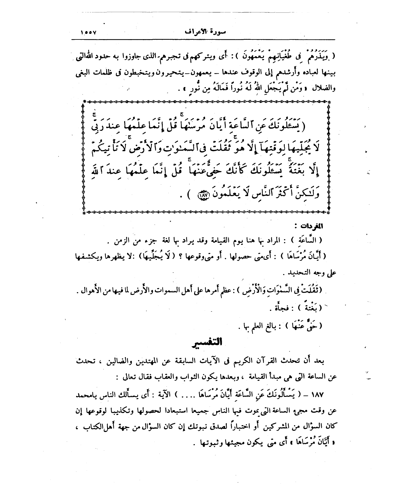 187 - {يَسْأَلُونَكَ عَنِ السَّاعَةِ أَيَّانَ مُرْسَاهَا .... } الآية: أَي يسأَلك الناِس يا محمَّد عن وقت مجىء الساعة التي يموت فيها الناس جميعًا استبعادا لحصولها وتكذيبا لوقوعها إِن كان السؤال من المشركين أَو اختبارًا لصدق نبوتك إِن كان السؤال من جهة أَهل الكتاب، {أَيَّانَ مُرْسَاهَا} أَي متى يكون مجيئها وثبوتها.