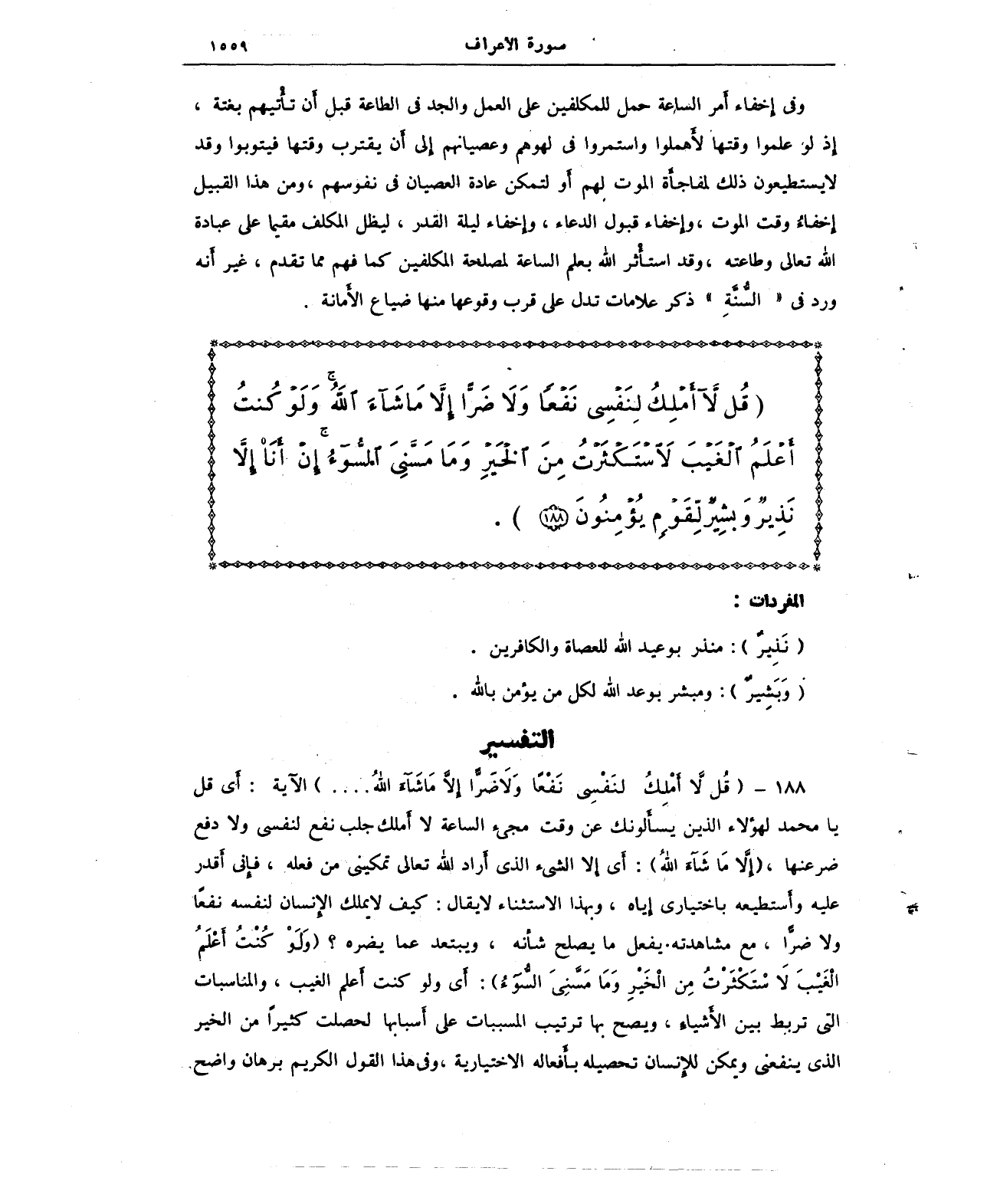 188 - {قُلْ لَا أَمْلِكُ لِنَفْسِي نَفْعًا وَلَا ضَرًّا إِلَّا مَا شَاءَ اللهُ .... } الآية: أَي قل يا محمَّد لهؤلاء الذين يسأَلونك عن وقت مجىء الساعة لا أَملك جلب نفع لنفسى ولا دفع ضر عنها، {إِلَّا مَا شَاءَ اللهُ}: أَي إلا الشىء الذي أراد الله تعالى تمكينى من فعله، فإنى أَقدر عليه وأَستطيعه باختيارى إِياه، وبهذا الاستثناء لا يقال: كيف لا يملك الإنسان لنفسه نفعًا ولا ضرًّا، مع مشاهدته. يفعل ما يصلح شأنه، ويبتعد عما يضره؟ {وَلَوْ كُنْتُ أَعْلَمُ الْغَيْبَ لَاسْتَكْثَرْتُ مِنَ الْخَيْرِ وَمَا مَسَّنِيَ السُّوءُ}: أَي ولو كنت أَعلم الغيب، والمناسبات التي تربط بين الأَشياءِ، ويصح بها ترتيب المسببات على أَسبابها لحصلت كثيرًا من الخير الذي ينفعنى ويمكن للإِنسان تحصيله بأَفعاله الاختيارية، وفي هذا القول الكريم برهان واضح
