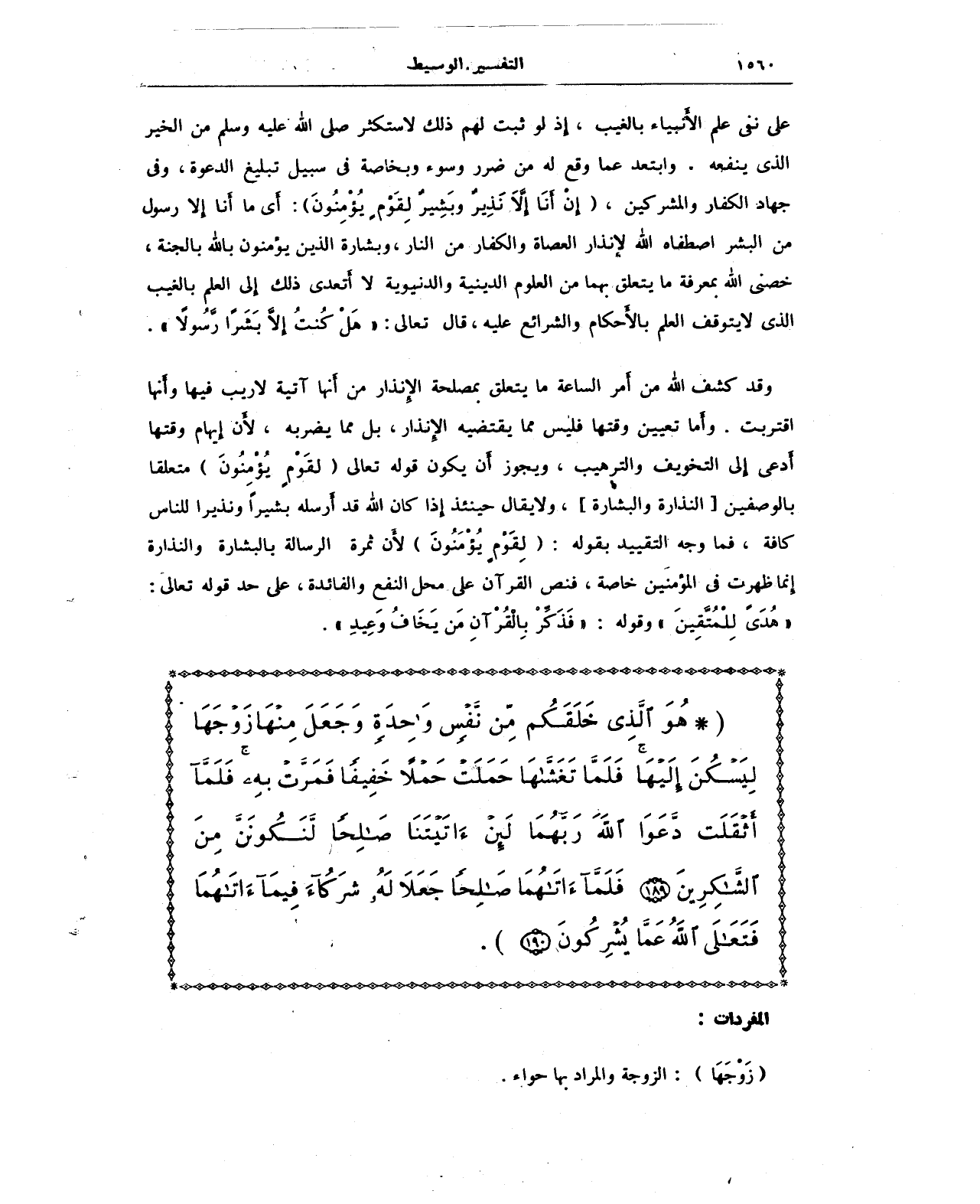 على نفى علم الأَنبياء بالغيب، إذ لو ثبت لهم ذلك لاستكثر - صلى الله عليه وسلم - من الخير الذي ينفعه, وابتعد عما وقع له من ضرر وسوء وبخاصة في سبيل تبليغ الدعوة، وفي جهاد الكفار والمشركين، {إِنْ أَنَا إِلَّا نَذِيرٌ وَبَشِيرٌ لِقَوْمٍ يُؤْمِنُونَ}: أَي ما أَنا إِلا رسول من البشر اصطفاه الله لإنذار العصاة والكفار من النار، وبشارة الذين يؤمنون باللهِ بالجنة، خصنى الله بمعرفة ما يتعلق بهما من العلوم الدينية والدنيوية لا أَتعدى ذلك إِلى العلم بالغيب الذي لا يتوقف العلم بالأَحكام والشرائع عليه، قال تعالى: {هَلْ كُنْتُ إِلَّا بَشَرًا رَسُولًا}.