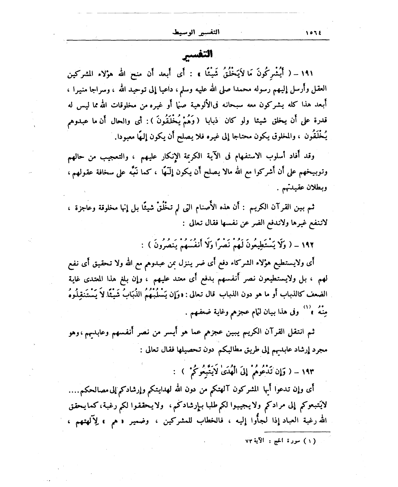 191 - {أَيُشْرِكُونَ مَا لَا يَخْلُقُ شَيْئًا}: أَي أَبعد أَن منح الله هؤلاء المشركين العقل وأَرسل إِليهم رسوله محمدا - صلى الله عليه وسلم -، داعيا إِلى توحيد الله، وسراجا منيرا، أَبعد هذا كله يشركون معه سبحانه في الألوهية صنما أَو غيره من مخلوقات الله مما ليس له قدرة على أَن يخلق شيئًا ولو كان ذبابا {وَهُمْ يُخْلَقُونَ}: أَي والحال أَن ما عبدوهم يُخْلَقُون، والمخلوق يكون محتاجا إلى غيره فلا يصلح أَن يكون إِلهًا معبودا.