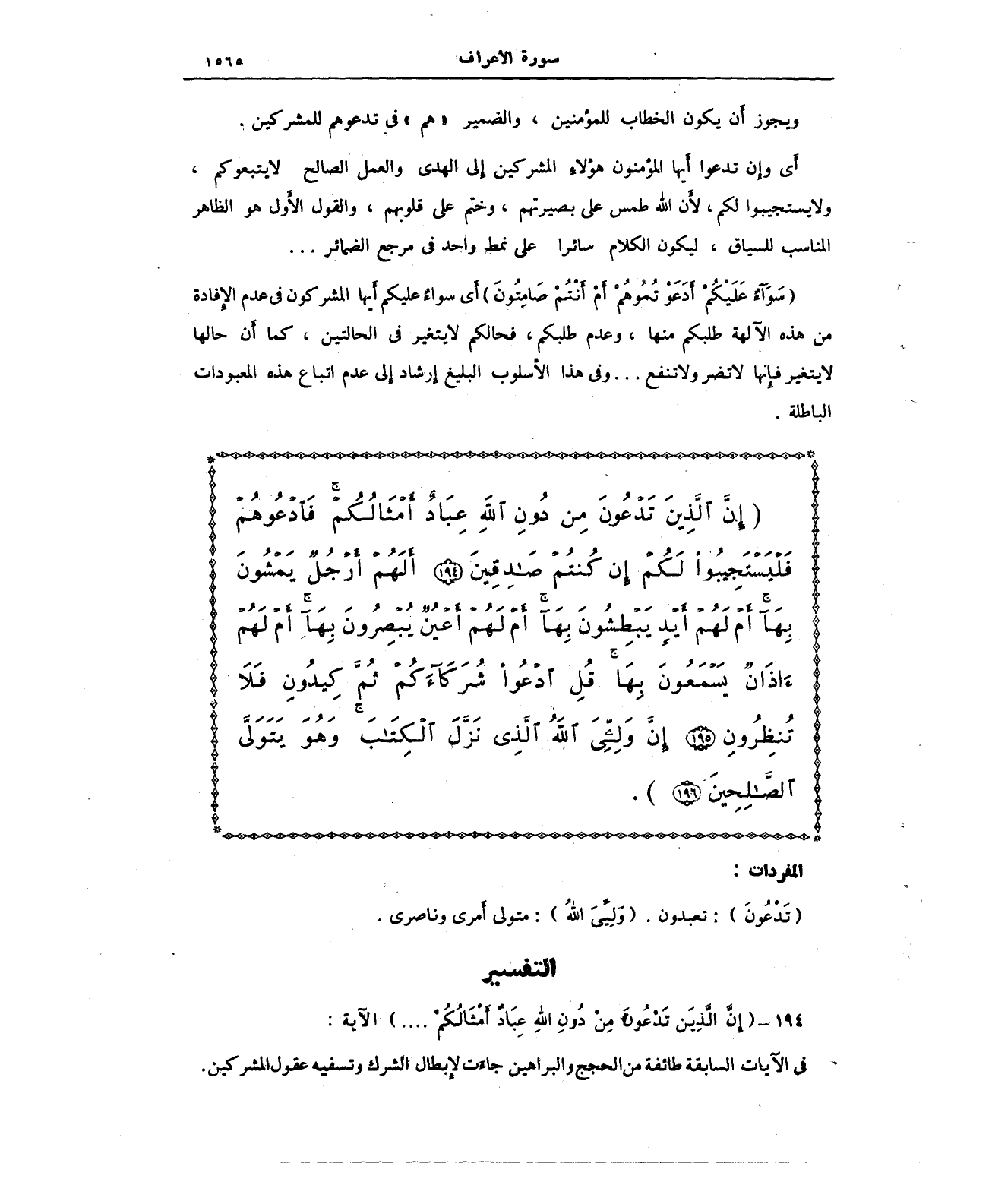 {إِنَّ الَّذِينَ تَدْعُونَ مِنْ دُونِ اللهِ عِبَادٌ أَمْثَالُكُمْ فَادْعُوهُمْ فَلْيَسْتَجِيبُوا لَكُمْ إِنْ كُنْتُمْ صَادِقِينَ (194) أَلَهُمْ أَرْجُلٌ يَمْشُونَ بِهَا أَمْ لَهُمْ أَيْدٍ يَبْطِشُونَ بِهَا أَمْ لَهُمْ أَعْيُنٌ يُبْصِرُونَ بِهَا أَمْ لَهُمْ آذَانٌ يَسْمَعُونَ بِهَا قُلِ ادْعُوا شُرَكَاءَكُمْ ثُمَّ كِيدُونِ فَلَا تُنْظِرُونِ (195) إِنَّ وَلِيِّيَ اللهُ الَّذِي نَزَّلَ الْكِتَابَ وَهُوَ يَتَوَلَّى الصَّالِحِينَ (196)}.