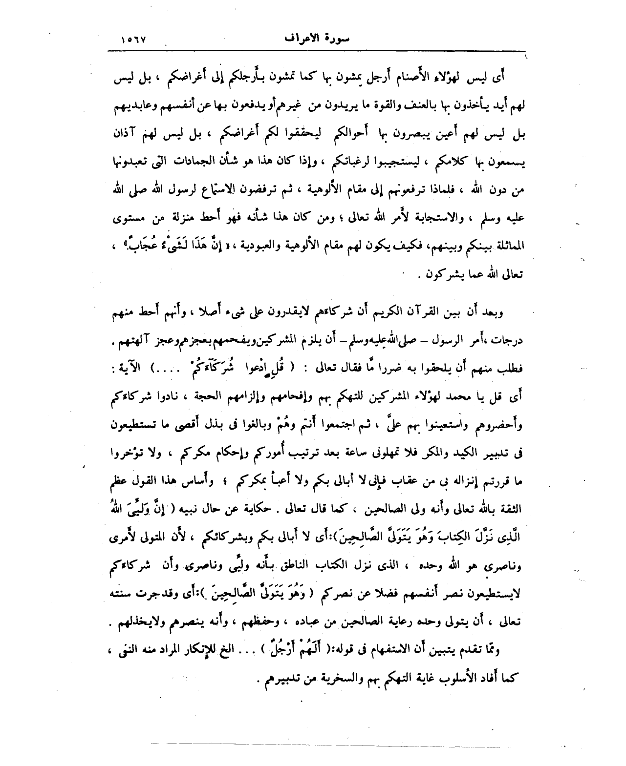 وبعد أَن بين القرآن الكريم أَن شركاءَهم لا يقدرون على شيء أَصلا، وأَنهم أَحط منهم درجات، أَمر الرسول - صلى الله عليه وسلم - أَن يلزم المشركين ويفحمهم بعجزهم وعجز آلهتهم. فطلب منهم أَن يلحقوا به ضررا ما فقال تعالى: {قُلِ ادْعُوا شُرَكَاءَكُمْ .... } الآية: أَي قل يا محمَّد لهؤلاء المشركين للتهكم بهم وإفحامهم وإِلزامهم الحجة، نادوا شركاءَكم وأَحضروهم واستعينوا بهم علىَّ، ثم اجتمعوا أَنتم وهُمْ وبالغوا في بذل أَقصى ما تستطيعون في تدبير الكيد والمكر فلا تمهلونى ساعة بعد ترتيب أُموركم وإِحكام مكركم، ولا تؤخروا مما قررتم إنزاله بى من عقاب فإِنى لا أبالى بكم ولا أَعبأ بمكركم، وأَساس هذا القول عظم الثقة باللهِ تعالى وأَنه ولى الصالحين, كما قال تعالى. حكاية عن حال نبيه {إِنَّ وَلِيِّيَ اللهُ الَّذِي نَزَّلَ الْكِتَابَ وَهُوَ يَتَوَلَّى الصَّالِحِينَ}: أَي لا أَبالى بكم وبشركائكم، لأَن المتولى لأَمرى وناصرى هو الله وحده، الذي نزل الكتاب الناطق بأَنه وليَّى وناصرى وأَن شركاءَكم لا يستطيعون نصر أَنفسهم فضلا عن نصركم {وَهُوَ يَتَوَلَّى الصَّالِحِينَ}: أَي وقد جرت سنته تعالى، أَن يتولى وحده رعاية الصالحين من عباده، وحفظهم، وأَنه ينصرهم ولا يخذلهم.