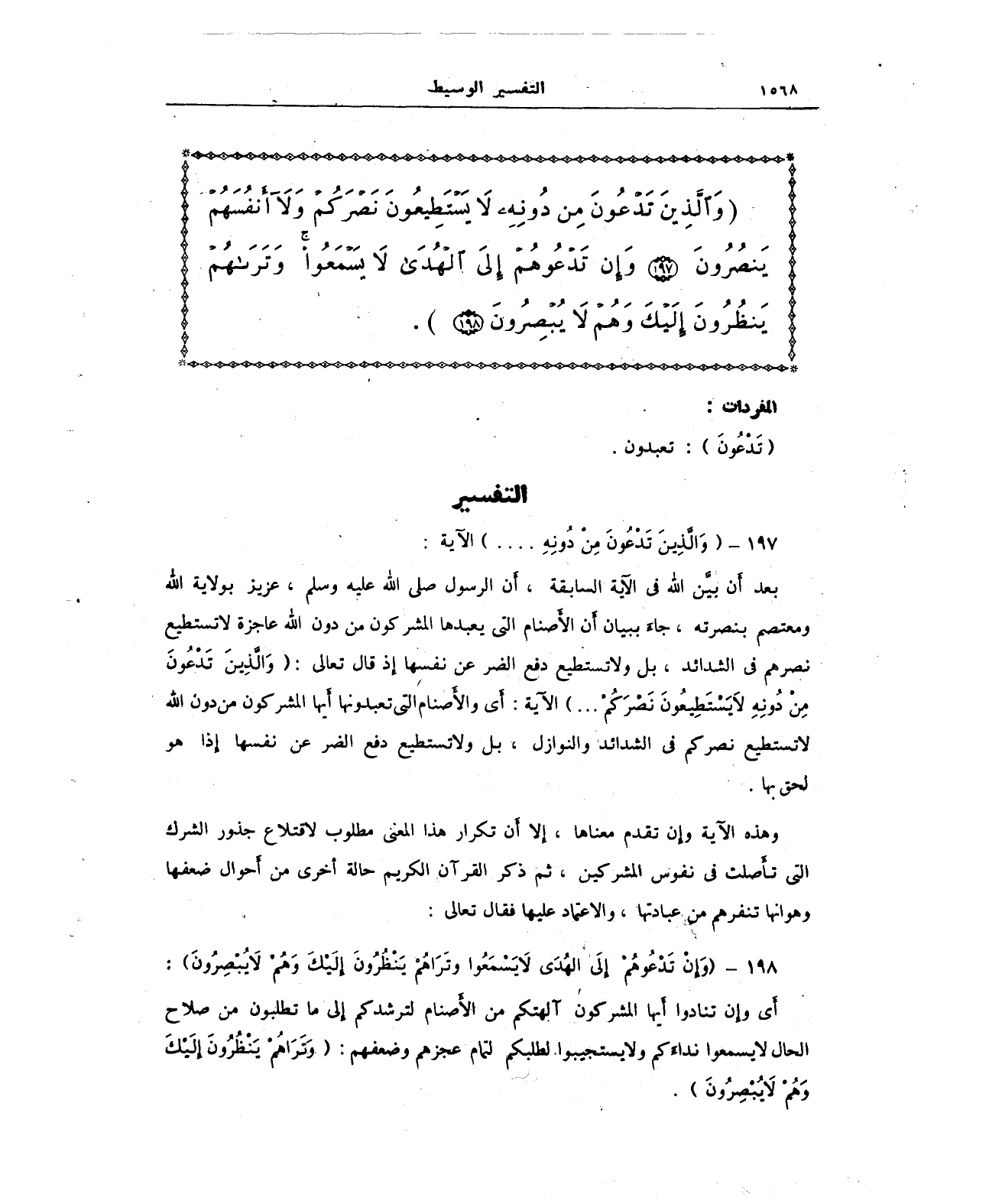 {وَالَّذِينَ تَدْعُونَ مِنْ دُونِهِ لَا يَسْتَطِيعُونَ نَصْرَكُمْ وَلَا أَنْفُسَهُمْ يَنْصُرُونَ (197) وَإِنْ تَدْعُوهُمْ إِلَى الْهُدَى لَا يَسْمَعُوا وَتَرَاهُمْ يَنْظُرُونَ إِلَيْكَ وَهُمْ لَا يُبْصِرُونَ (198)}.