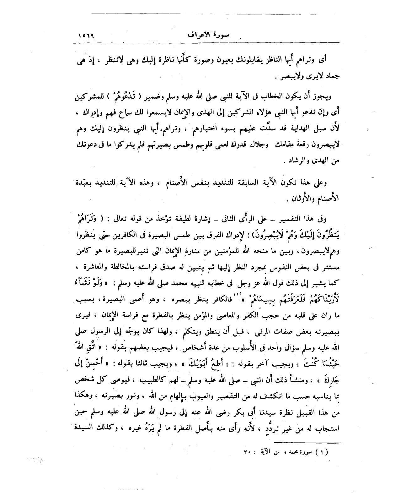 وفي هذا التفسير - على الرأْى الثاني - إشارة لطيفة تؤخذ من قوله تعالى: {وَتَرَاهُمْ يَنْظُرُونَ إِلَيْكَ وَهُمْ لَا يُبْصِرُونَ}: لإِدراك الفرق بين طمس البصيرة في الكافرين حتى ينظروا وهم لا يبصرون، وبين ما منحه الله للمؤمنين من منارة الإِيمان التي تنير للبصيرة ما هو كامن مستتر في بعض النفوس بمجرد النظر إِليها ثم يتبين له صدق فراسته بالمخالطة والمعاشرة، كما يشير إِلى ذلك قول الله عَزَّ وَجَلَّ في خطابه لنبيه محمَّد - صلى الله عليه وسلم -: {وَلَوْ نَشَاءُ لَأَرَيْنَاكَهُمْ فَلَعَرَفْتَهُمْ بِسِيمَاهُمْ} (¬1) فالكافر ينظر ببصره، وهو أَعمى البصيرة، بسبب ما ران على قلبه من حجب الكفر والمعاصي والمؤمن ينظر بالفطرة مع فراسة الإِيمان، فيرى ببصيرته بعض صفات المرئى, قبل أَن ينطق ويتكلم، ولهذا كان يوجّه إِلى الرسول - صلى الله عليه وسلم - سؤال واحد في الأُسلوب من عدة أَشخاص، فيجيب بعضهم بقوله: "اتَّقِ الله حَيْثُمَا كُنْتَ" ويجيب آخر بقوله: "أطِعُ أَبَوَيْكَ"، ويجيب ثالثا بقوله: "أَحْسِنْ إلَى جَارِكَ"، ومنشأ ذلك أَن النبي - صلى الله عليه وسلم - لهم كالطبيب, فيوصى كل شخص بما يناسبه حسب ما انكشف له من التقصير والعيوب بإِلهام من الله، ونور بصيرته، وهكذا من هذا القبيل نظرة سيدنا أَبي بكر - رضي الله عنه - إِلى رسول الله - صلى الله عليه وسلم - حين استجاب له من غير تردُّدٍ, لأَنه رأَى منه بأَصل الفطرة ما لم يَرَهُ غيره، وكذلك السيدة