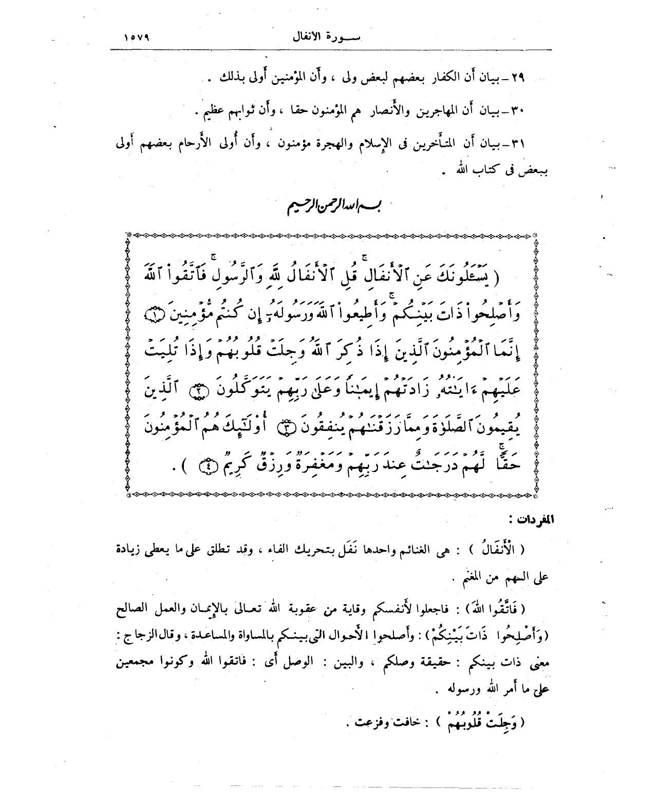 {يَسْأَلُونَكَ عَنِ الْأَنْفَالِ قُلِ الْأَنْفَالُ لِلَّهِ وَالرَّسُولِ فَاتَّقُوا اللهَ وَأَصْلِحُوا ذَاتَ بَيْنِكُمْ وَأَطِيعُوا اللهَ وَرَسُولَهُ إِنْ كُنْتُمْ مُؤْمِنِينَ (1) إِنَّمَا الْمُؤْمِنُونَ الَّذِينَ إِذَا ذُكِرَ اللهُ وَجِلَتْ قُلُوبُهُمْ وَإِذَا تُلِيَتْ عَلَيْهِمْ آيَاتُهُ زَادَتْهُمْ إِيمَانًا وَعَلَى رَبِّهِمْ يَتَوَكَّلُونَ (2) الَّذِينَ يُقِيمُونَ الصَّلَاةَ وَمِمَّا رَزَقْنَاهُمْ يُنْفِقُونَ (3) أُولَئِكَ هُمُ الْمُؤْمِنُونَ حَقًّا لَهُمْ دَرَجَاتٌ عِنْدَ رَبِّهِمْ وَمَغْفِرَةٌ وَرِزْقٌ كَرِيمٌ (4)}.