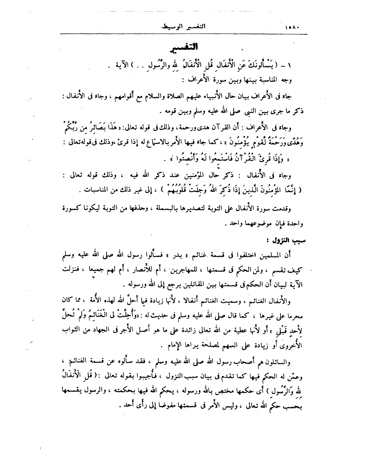 أَن المسلمين اختلفوا في قسمة غنائم "بدر" فسأَلوا رسول الله - صلى الله عليه وسلم - كيف تقسم، ولمن الحكم في قسمتها, للمهاجرين، أَم للأَنصار، أَم لهم جميعًا، فنزلت الآية لبيان أَن الحكم في قسمتها بين المقاتلين يرجع إِلى الله ورسوله.