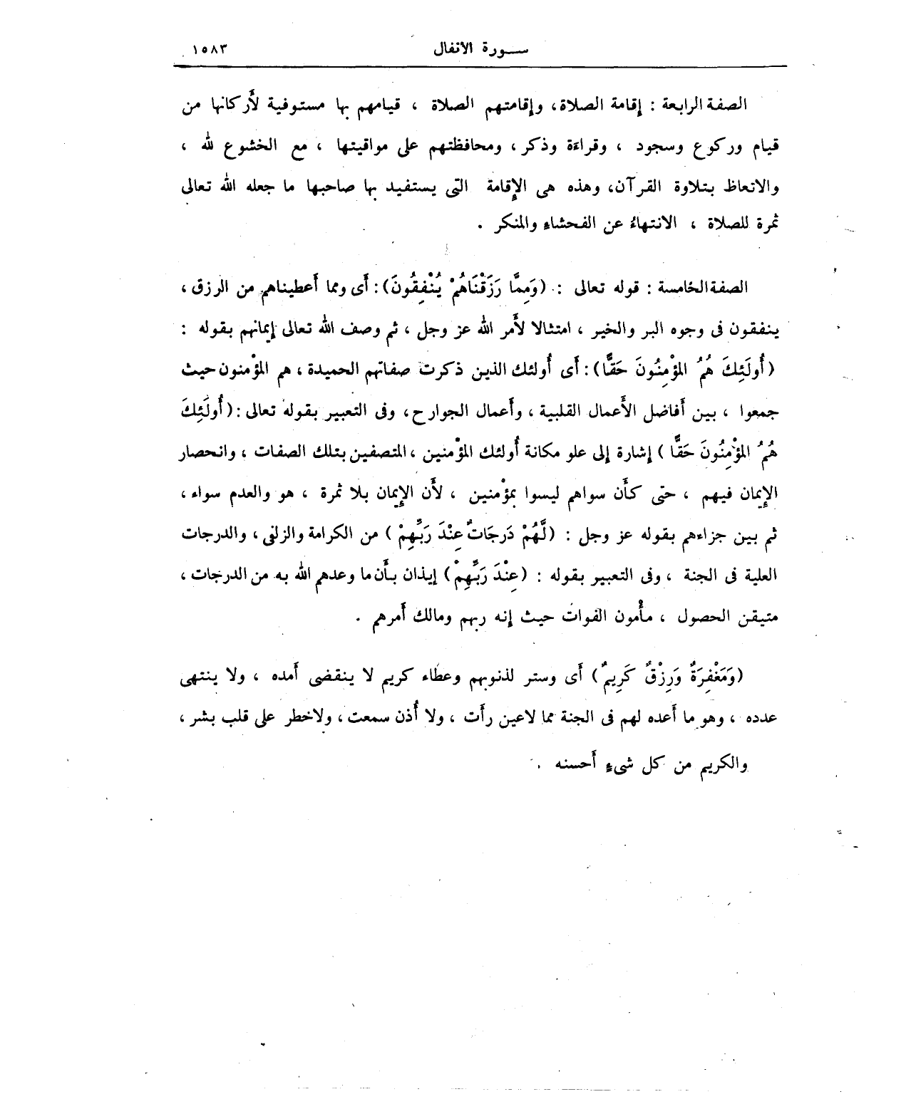 الصفة الخامسة: قوله تعالى: {وَمِمَّا رَزَقْنَاهُمْ يُنْفِقُونَ}: أَي ومما أَعطيناهم من الرزق، ينفقون في وجوه البر والخير، امتثالا لأَمر الله عز وجل، ثم وصف الله تعالى إِيمانهم بقوله: {أُولَئِكَ هُمُ الْمُؤْمِنُونَ حَقًّا}: أَي أُولئك الذين ذكرت صفاتهم الحميدة، هم المؤْمنون حيث جمعوا، بين أَفاضل الأَعمال القلبية، وأَعمال الجوارح، وفي التعبير بقوله تعالى: {أُولَئِكَ هُمُ الْمُؤْمِنُونَ حَقًّا} إِشارة إِلى علو مكانة أُولئك المؤْمنين، المتصفين بتلك الصفات، وانحصار الإِيمان فيهم، حتى كأَن سواهم ليسوا بمؤْمنين، لأَن الإِيمان بلا ثمرة، هو والعدم سواء، ثم بين جزاءهم بقوله عز وجل: {لَهُمْ دَرَجَاتٌ عِنْدَ رَبِّهِمْ} من الكرامة والزلفى، والدرجات العلية في الجنة، وفي التعبير بقوله: {عِنْدَ رَبِّهِمْ} إيذان بأَن ما وعدهم الله به من الدرجات، متيقن الحصول، مأْمون الفوات حيث إِنه ربهم ومالك أَمرهم.