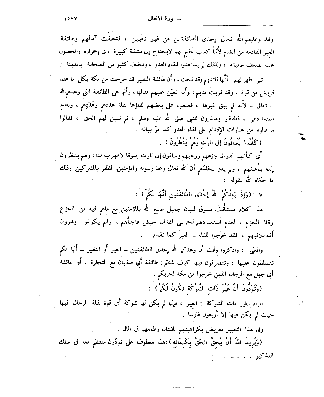 والمعنى: واذكروا وقت أَن وعدكم الله إِحدى الطائفتين - العير أَو النفير - أَنها لكم تتسلطون عليها، وتتصرفون فيها كيف شئتم: طائفة أَبي سفيان مع التجارة، أَو طائفة أَبي جهل مع الرجال الذين خرجوا من مكة لحربكم.