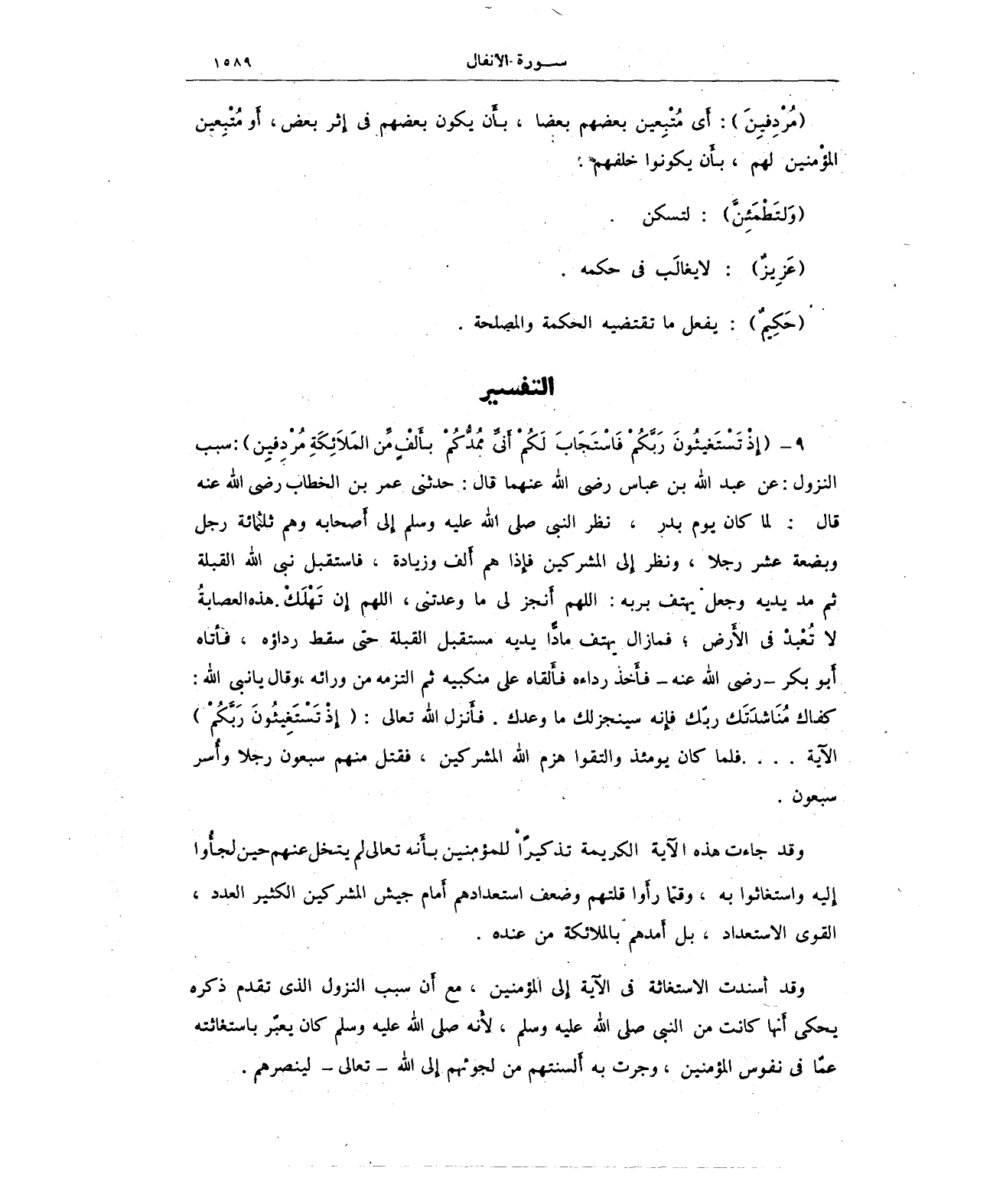 9 - {إِذْ تَسْتَغِيثُونَ رَبَّكُمْ فَاسْتَجَابَ لَكُمْ أَنِّي مُمِدُّكُمْ بِأَلْفٍ مِنَ الْمَلَائِكَةِ مُرْدِفِينَ}: سبب النزول: عن عبد الله بن عباس رضي الله عنهما قال: حدثنى عمر بن الخطاب رضي الله عنه قال: لما كان يوم بدر، نظر النبي - صلى الله عليه وسلم - إِلى أَصحابه وهم ثلثمائة رجل وبضعة عشر رجلًا، ونظر إِلى المشركين فإِذا هم أَلف وزيادة، فاستقبل نبى الله القبلة ثم مد يديه وجعل يهتف بربه: اللهم أَنجز لى ما وعدتنى، اللهم إِن تَهْلَكْ هذه العصابةُ لا تُعْبدْ في الأَرض، فما زال يهتف مادًّا يديه مستقبل القبلة حتى سقط رداؤه، فأتاه أَبو بكر - رضي الله عنه - فأَخذ رداءه فأَلقاه على منكبيه ثم التزمه من ورائه، وقال يا نبى الله: كفاك مُنَاشدَتَك ربّك فإِنه سينجز لك ما وعدك. فأَنزل الله تعالى: {إِذْ تَسْتَغِيثُونَ رَبَّكُمْ} الآية .... فلما كان يومئذ والتقوا هزم الله المشركين، فقتل منهم سبعون رجلا وأُسر سبعون.