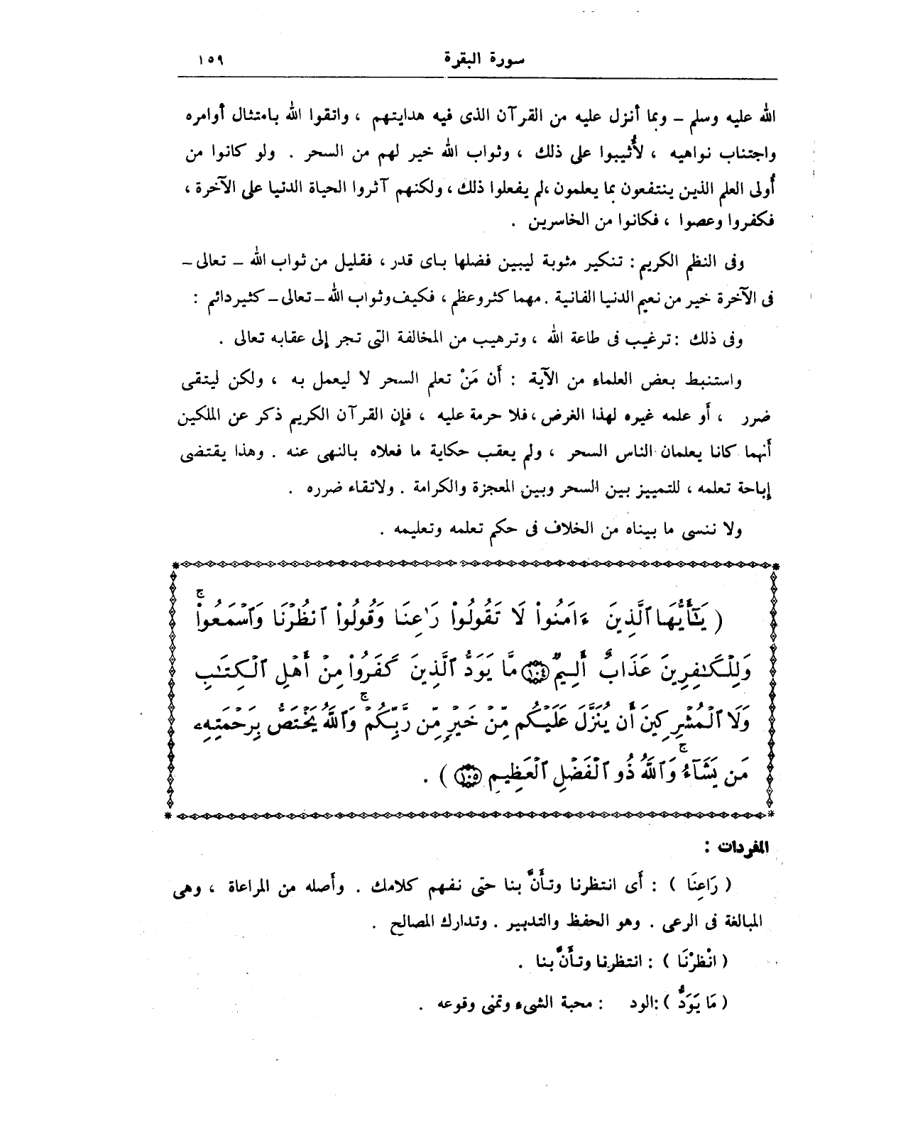 {يَا أَيُّهَا الَّذِينَ آمَنُوا لَا تَقُولُوا رَاعِنَا وَقُولُوا انْظُرْنَا وَاسْمَعُوا وَلِلْكَافِرِينَ عَذَابٌ أَلِيمٌ (104) مَا يَوَدُّ الَّذِينَ كَفَرُوا مِنْ أَهْلِ الْكِتَابِ وَلَا الْمُشْرِكِينَ أَنْ يُنَزَّلَ عَلَيْكُمْ مِنْ خَيْرٍ مِنْ رَبِّكُمْ وَاللَّهُ يَخْتَصُّ بِرَحْمَتِهِ مَنْ يَشَاءُ وَاللَّهُ ذُو الْفَضْلِ الْعَظِيمِ (105)}.