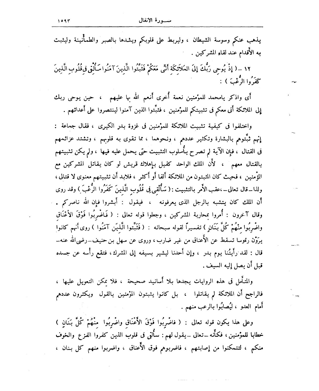 واختلفوا في كيفية تثبيت الملائكة للمؤمنين في غزوة بدر الكبرى، فقال جماعة: إِنهم ثبَّتوهم بالبشارة وتكثير عددهم، ونحوهما، مما تقوى به قلوبهم، وتشتد عزائمهم في القتال، فإِن الآية لم تصرح بأُسلوب التثبيت حتى يحمل عليه فيها, ولم يكن تثبيتهم بالقتال معهم، لأَن الملك الواحد كفيل بإِهلاك قريش لو كان يقاتل المشركين مع المؤْمنين، فحيث كان المثبتون من الملائكة أَلفا أَو أَكثر، فلا بد أَن تثبيتهم معنوى لا قتالى، ولذا - قال تعالى -، عقب الأَمر بالتثبيت: {سَأُلْقِي في قُلُوبِ الَّذِينَ كَفَرُوا الرُّعْبَ} وقد روى أن الملك كان يتشبه بالرجل الذي يعرفونه، فيقول: أَبشروا فإِن الله ناصركم. وقال آخرون: أُمروا بمحاربة المشركين، وجعلوا قوله تعالى: {فَاضْرِبُوا فَوْقَ الْأَعْنَاقِ وَاضْرِبُوا مِنْهُمْ كُلَّ بَنَانٍ} تفسيرًا لقوله سبحانه: {فَثَبِّتُوا الَّذِينَ آمَنُوا} روى أَنهم كانوا يرَوْن رءُوسا تسقط عن الأَعناق من غير ضارب، وروى عن سهل بن حنيف - رضي الله عنه - قال: لقد رأَيتُنا يوم بدر، وإن أَحدنا ليشير بسيفه إِلى المشرك، فتقع رأْسه عن جسده قبل أَن يصل إِليه السيف.