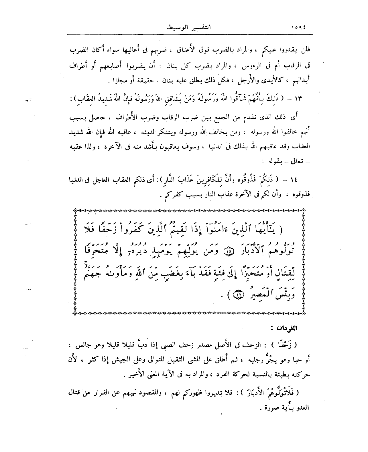 {يَا أَيُّهَا الَّذِينَ آمَنُوا إِذَا لَقِيتُمُ الَّذِينَ كَفَرُوا زَحْفًا فَلَا تُوَلُّوهُمُ الْأَدْبَارَ (15) وَمَنْ يُوَلِّهِمْ يَوْمَئِذٍ دُبُرَهُ إِلَّا مُتَحَرِّفًا لِقِتَالٍ أَوْ مُتَحَيِّزًا إِلَى فِئَةٍ فَقَدْ بَاءَ بِغَضَبٍ مِنَ اللهِ وَمَأْوَاهُ جَهَنَّمُ وَبِئْسَ الْمَصِيرُ (16)}.