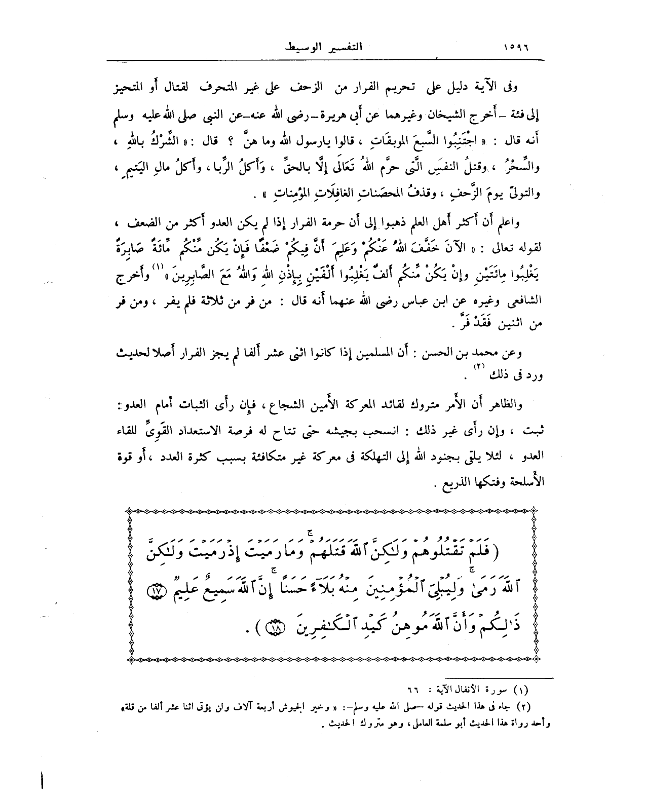 والظاهر أَن الأمر متروك لقائد المعركة الأَمين الشجاع، فإِن رأَى الثبات أمام العدو: ثبت، وإِن رأَى غير ذلك: انسحب بجيشه حتى تتاح فرصة الاستعداد القَوِىِّ للقاء العدو، لئلا يلقى بجنود الله إلى التهلكة في معركة غير متكافئة بسبب كثرة العدد، أَو قوة الأَسلحة وفتكها الذريع.