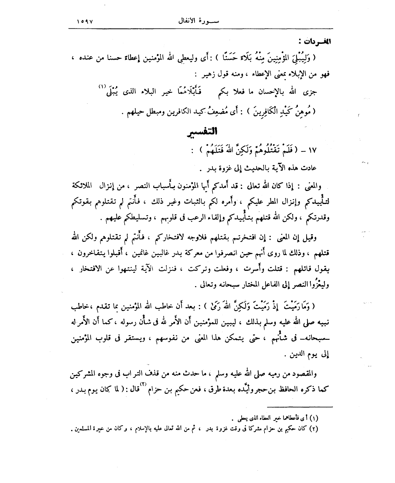 والمعنى: إِذا كان الله تعالى: قد أَمدكم أَيها المؤمنون بأَسباب النصر، من إِنزال الملائكة لتأْييدكم وإِنزال المطر عليكم، وأَمره لكم بالثبات وغير ذلك، فأَنتم لم تقتلوهم بقوتكم وقدرتكم، ولكن الله قتلهم بتأْييدكم وإلقاء الرعب في قلوبهم، وتسليطكم عليهم.
