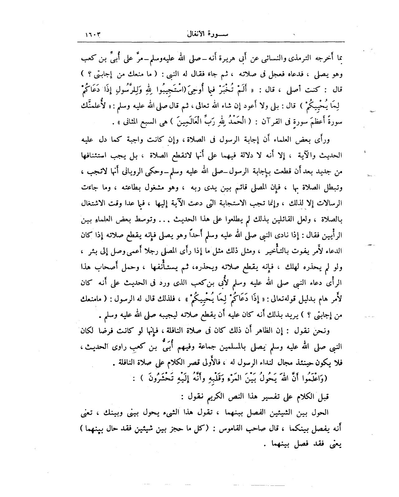 ورأَى بعض العلماء أَن إِجابة الرسول في الصلاة، وإِن كانت واجبة كما دل عليه الحديث والآية، إِلا أَنه لا دلالة فيهما على أَنها لا تقطع الصلاة، بل يجب استئنافها من جديد بعد أَن قطعت بإِجابة الرسول - صلى الله عليه وسلم - وحكى الرويانى أَنها لا تجب، وتبطل الصلاة بها، فإِن المصلى قائم بين يدي ربه، وهو مشغول بطاعته، وما جاءَت الرسالات إِلا لذلك، وإِنما تجب الاستجابة التي دعت الآية إِليها، فيما عدا وقت الاشتغال بالصلاة، ولعل القائلين بذلك لم يطلعوا على هذا الحديث ... وتوسط بعض العلماءِ بين الرأْيين فقال: إِذا نادى النبي - صلى الله عليه وسلم - أَحدًا وهو يصلى فإنه يقطع صلاته إذا كان الدعاء لأَمر يفوت بالتأْخير، ومثل ذلك مثل ما إِذا رأَى المصلى رجلًا أَعمى وصل إلى بئر, ولو لم يحذره لهلك، فإِنه يقطع صلاته ويحذره، ثم يستأْنفها، وحمل أَصحاب هذا الرأْى دعاء النبي - صلى الله عليه وسلم - لأُبى بن كعب الذي ورد في الحديث على أَنه كان لأَمر هام بدليل قوله تعالى: {إِذَا دَعَاكُمْ لِمَا يُحْيِيكُمْ}، فلذلك قال له الرسول: (ما منعك من إجابتى؟) يريد بذلك أَنه كان عليه أَن يقطع صلاته ليجيبه - صلى الله عليه وسلم -.