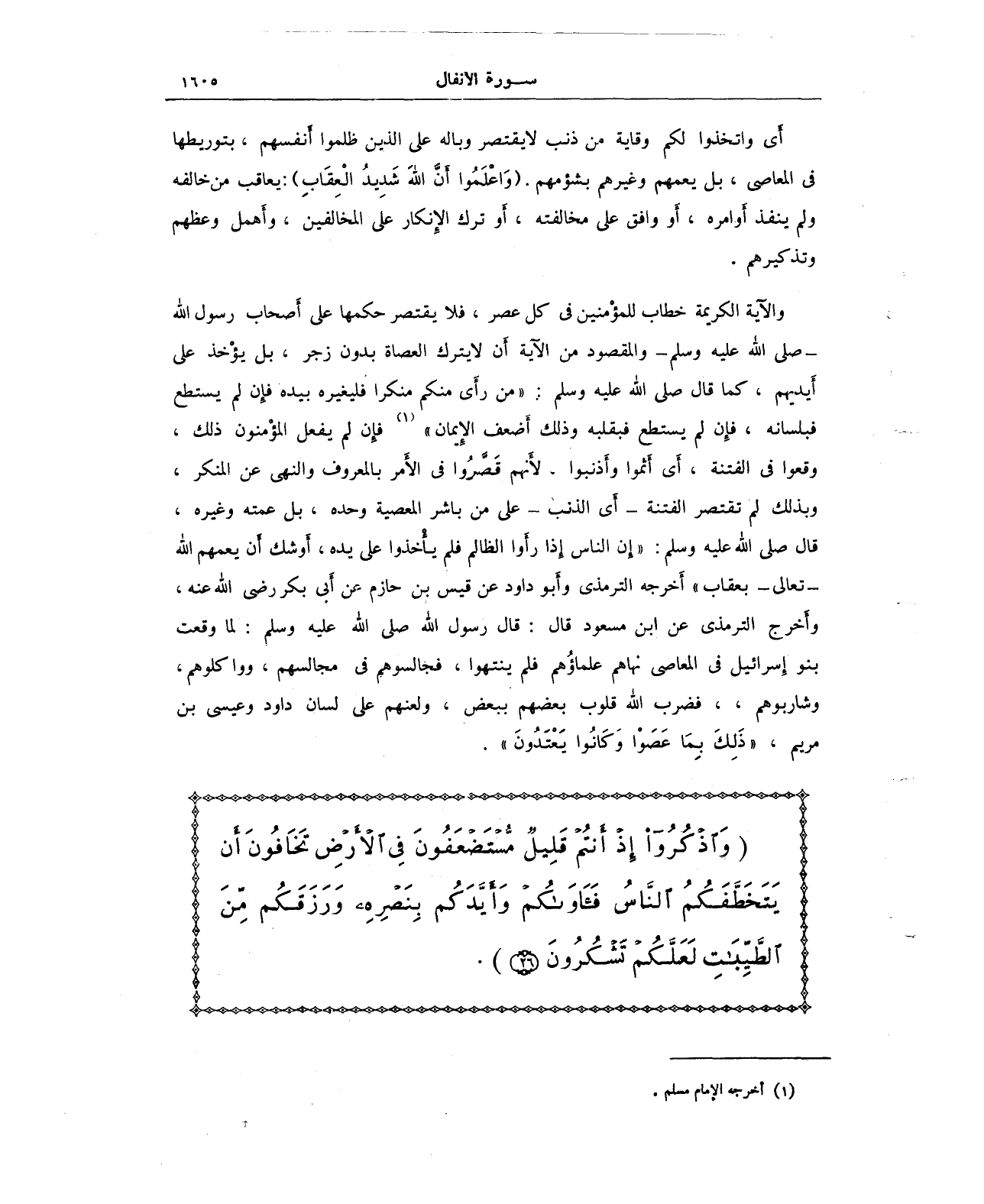 والآية الكريمة خطاب للمؤْمنين في كل عصر، فلا يقتصر حكمها على أَصحاب رسول الله - صلى الله عليه وسلم - والمقصود من الآية أَن لا يترك العصاة بدون زجر، بل يؤْخذ على أَيديهم، كما قال - صلى الله عليه وسلم -: "من رأَى منكم منكرا فليغيره بيده فإِن لم يستطع فبلسانه، فإِن لم يستطع فبقلبه وذلك أَضعف الإِيمان" (¬1) فإِن لم يفعل المؤْمنون ذلك، وقعوا في الفتنة، أَي أثموا وأَذنبوا, لأَنهم قَصَّرُوا في الأَمر بالمعروف والنهي عن المنكر، وبذلك لم تقتصر الفتنة - أَي الذنب - على من باشر المعصية وحده، بل عمته وغيره، قال - صلى الله عليه وسلم -: "إن الناس إِذا رأَوا الظالم فلم يأْخذوا على يده، أَوشك أَن يعمهم الله - تعالى - بعقاب" أَخرجه الترمذي وأَبو داود عن قيس بن حازم عن أَبي بكر - رضي الله عنه -، وأَخرج الترمذي عن ابن مسعود قال: قال رسول الله - صلى الله عليه وسلم -: لما وقعت بنو إِسرائيل في المعاصي نهاهم علماؤُهم فلم ينتهوا، فجالسوهم في مجالسهم، وواكلوهم، وشاربوهم، فضرب الله قلوب بعضهم ببعض، ولعنهم على لسان داود وعيسى بن مريم، {ذَلِكَ بِمَا عَصَوْا وَكَانُوا يَعْتَدُونَ} ".