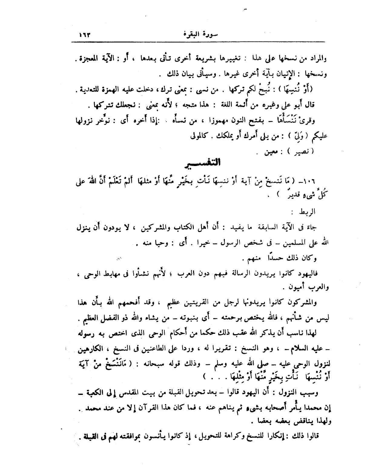 لهذا ناسب أَن يذكر الله عقب ذلك حكمًا من أَحكام الوحى الذي اختص به رسوله - عليه السلام -، وهو النسخ: تقريرا له، وردا على الطاعنين في النسخ، الكارهين لنزول الوحي عليه - صلى الله عليه وسلم - وذلك قوله سبحانه: {مَا نَنْسَخْ مِنْ آيَةٍ أَوْ نُنْسِهَا نَأْتِ بِخَيْرٍ مِنْهَا أَوْ مِثْلِهَا ... }