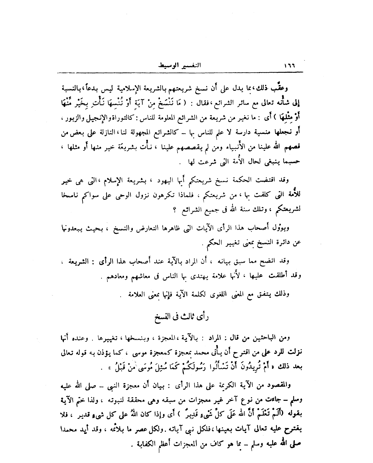 وعقَّب. ذلك، بما يدل على أن نسخ شريعتهم بالشريعة الإسلامية ليس بدعًا، بالنسبة إلى شأنه وإلى مع سائر الشرائع، فقال: {مَا نَنْسَخْ مِنْ آيَةٍ أَوْ نُنْسِهَا نَأْتِ بِخَيْرٍ مِنْهَا أَوْ مِثْلِهَا} أَي: ما نغير من شريعة من الشرائع العلومة للناس: كالتوراة والإِنجيل والزبور، أو نجعلها منسية دارسة لا علم للناس بها - كالشرائع المجهولة لنا، النازلة على بعض من قصهم الله علينا من الأَنبياء ومن لم يقصصهم علينا، نأْت بشريعَة هَة خير منها أَو مثلها، حسبما ينبغى لحال الأْمة التي شرعت لها.