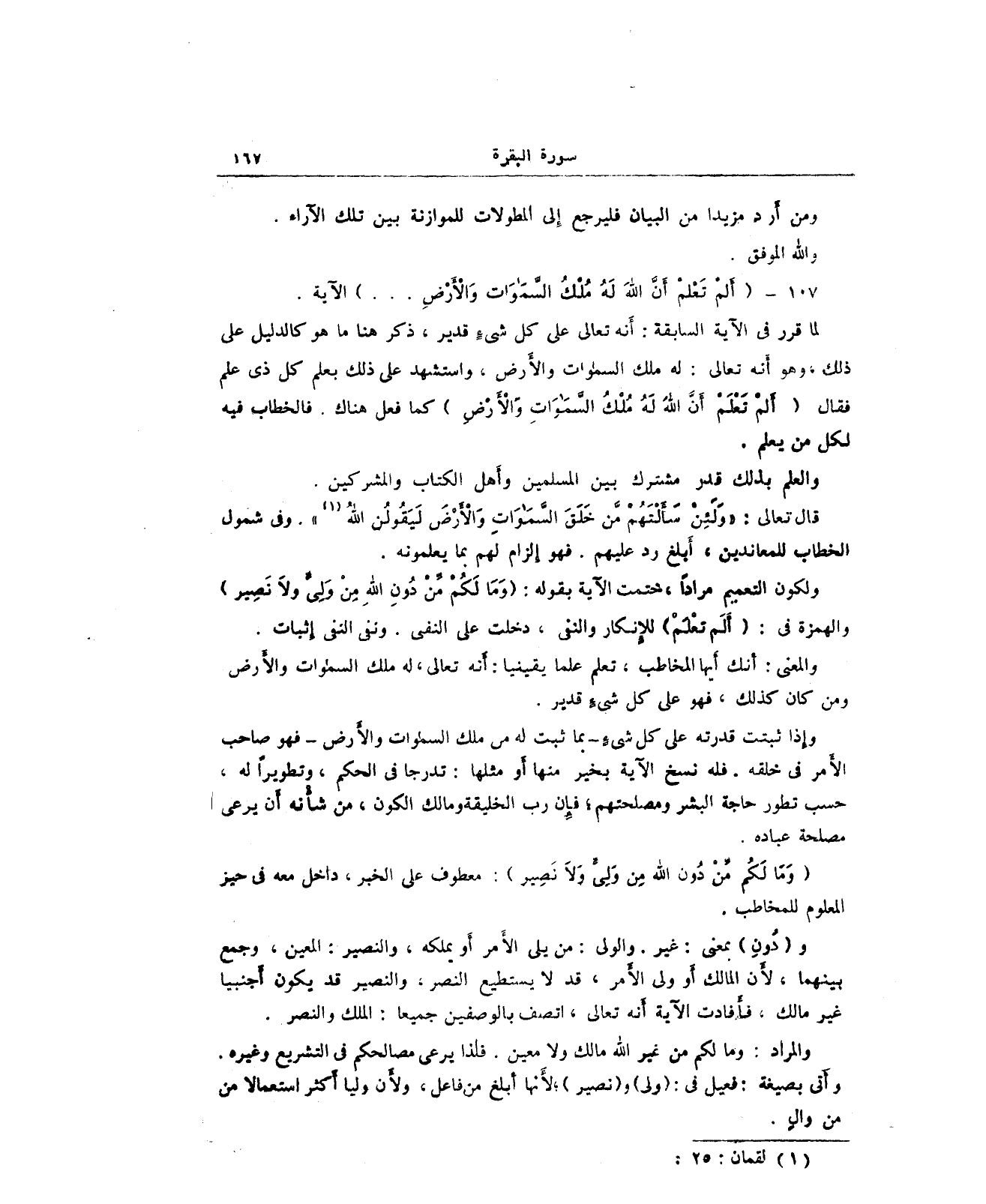 ولكون التعميم مرادًا، ختمت الآية بقوله: {وَمَا لَكُمْ مِنْ دُونِ اللَّهِ مِنْ وَلِيٍّ وَلَا نَصِيرٍ} والهمزة في: {أَلَم تعْلَمْ} للإِنكار والنفي، دخلت النفي. ونفى النفي إثبات. والمعنى: أنك أَيها المخاطب، تعلم علمًا يقينيا: أنه تعالى، له ملك السنوات والأرض ومن كان كذلك، فهو على كل شئِ قدير.