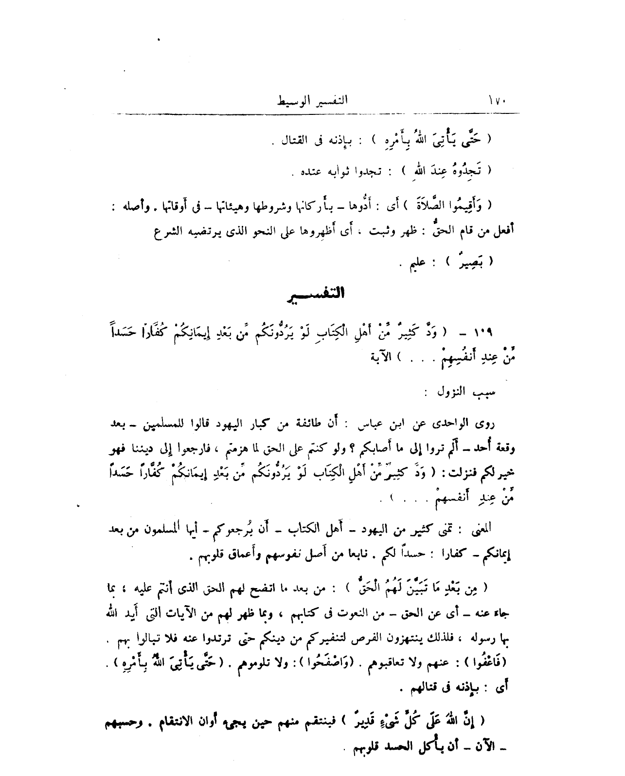 روى الواحدي عن ابن عباس: أن طائفة من كبار اليهود قالوا للمسلمين - بعد وقعة أحد - ألم تروا إلى ما أصابكم؟ ولو كنتم على الحق لما هزمتم، فارجعوا إلي ديننا فهو خير لكم فنزلت: {وَدَّ كَثِيرٌ مِنْ أَهْلِ الْكِتَابِ لَوْ يَرُدُّونَكُمْ مِنْ بَعْدِ إِيمَانِكُمْ كُفَّارًا حَسَدًا مِنْ عِنْدِ أَنْفُسِهِمْ ... }