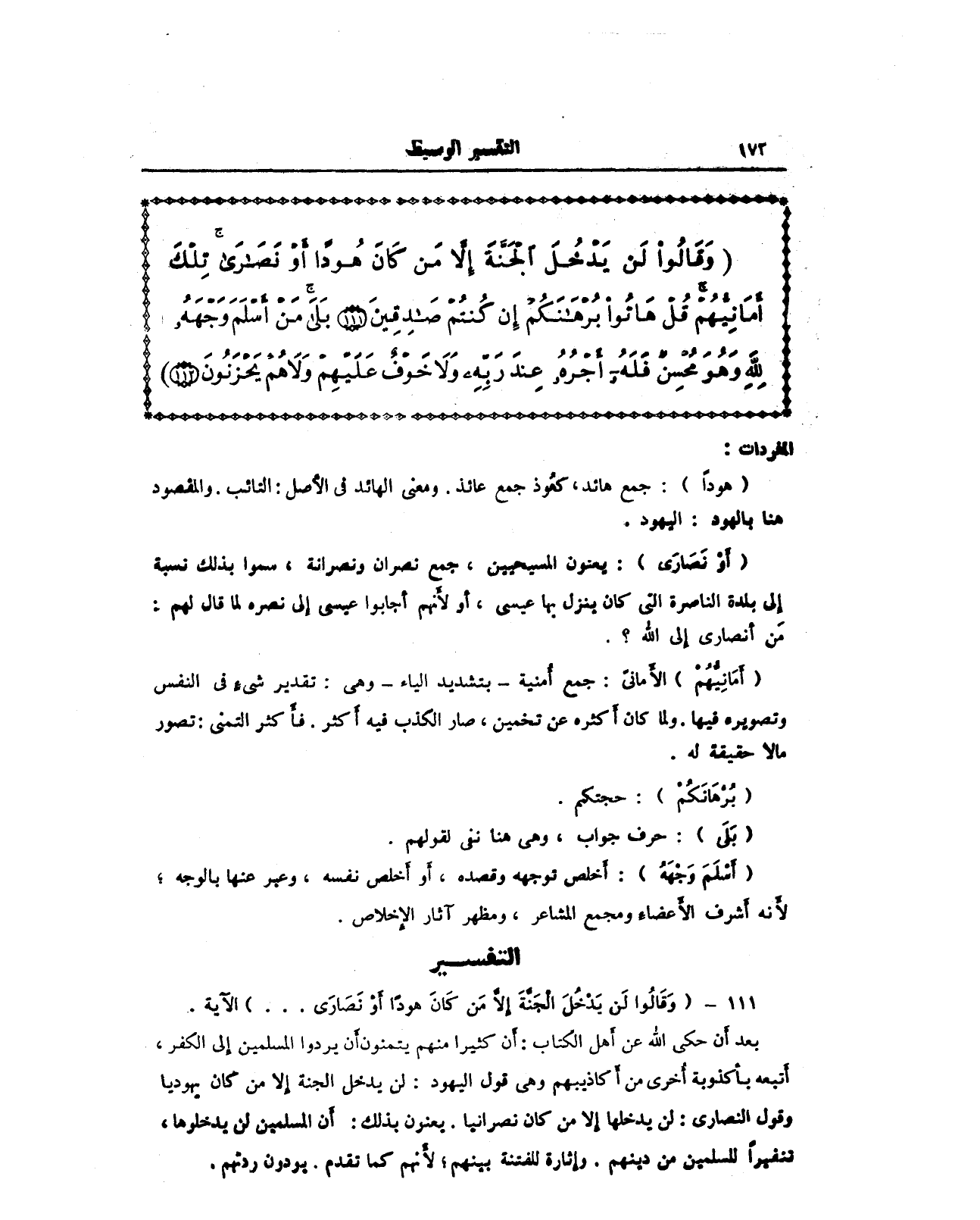 111 - {وَقَالُوا لَنْ يَدْخُلَ الْجَنَّةَ إِلَّا مَنْ كَانَ هُودًا أَوْ نَصَارَى ... } الآية.