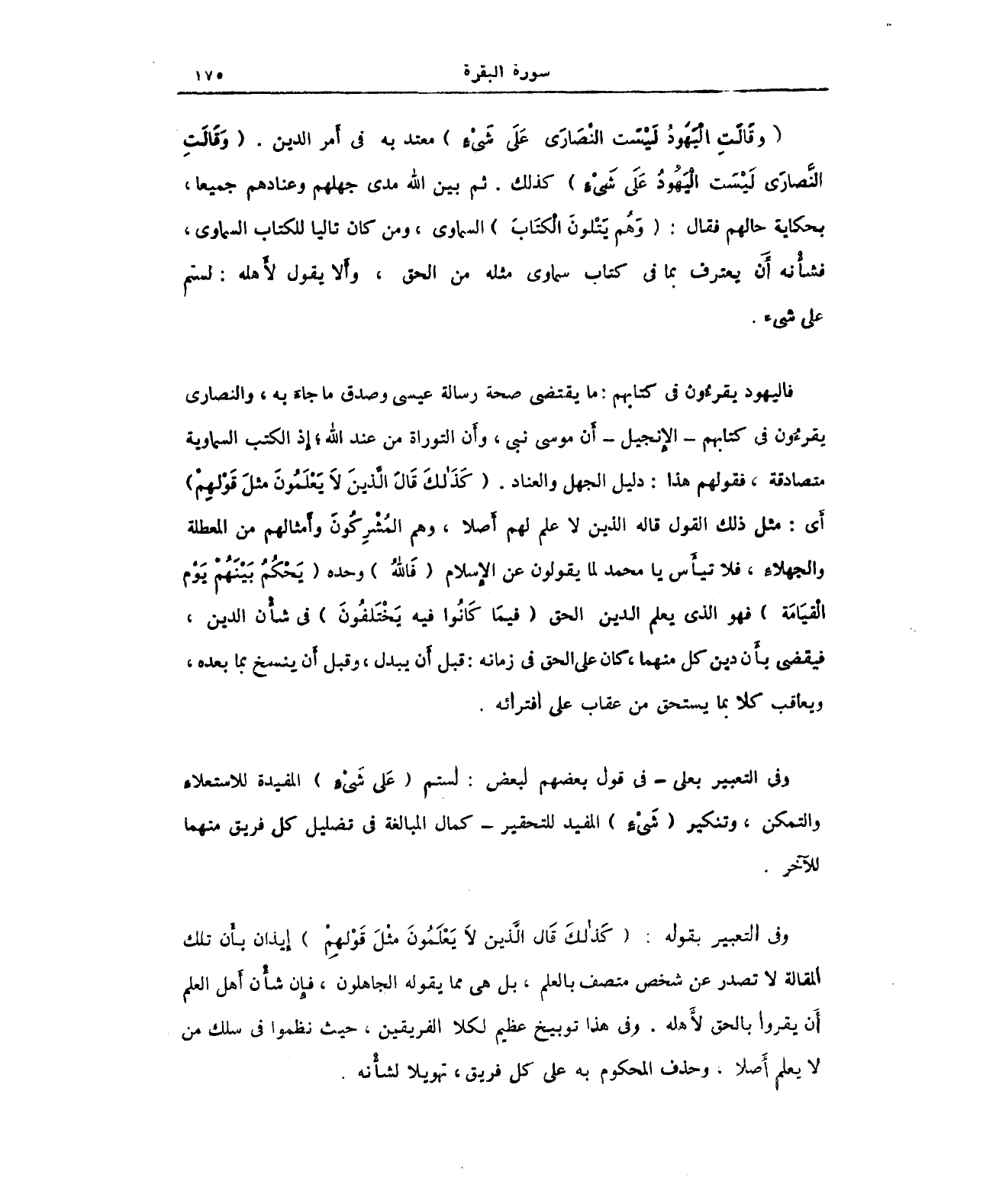 {وَقَالَتِ الْيَهُودُ لَيْسَتِ النَّصَارَى عَلَى شَيْءٍ} معتد به في أمر الدين. {وَقَالَتِ النَّصَارَى لَيْسَتِ الْيَهُودُ عَلَى شَيْءٍ} كذلك. ثم الله مدى جهلهم وعنادهم جميعًا، بحكاية حالهم فقال: {وَهُمْ يَتْلُونَ الْكِتَابَ} السماوي، ومن كان تاليًا للكتاب السماوي، فشأنه أن يعترف بما في كتاب سماوي مثله من الحق، وألا يقول لأهله: لستم على شيء.