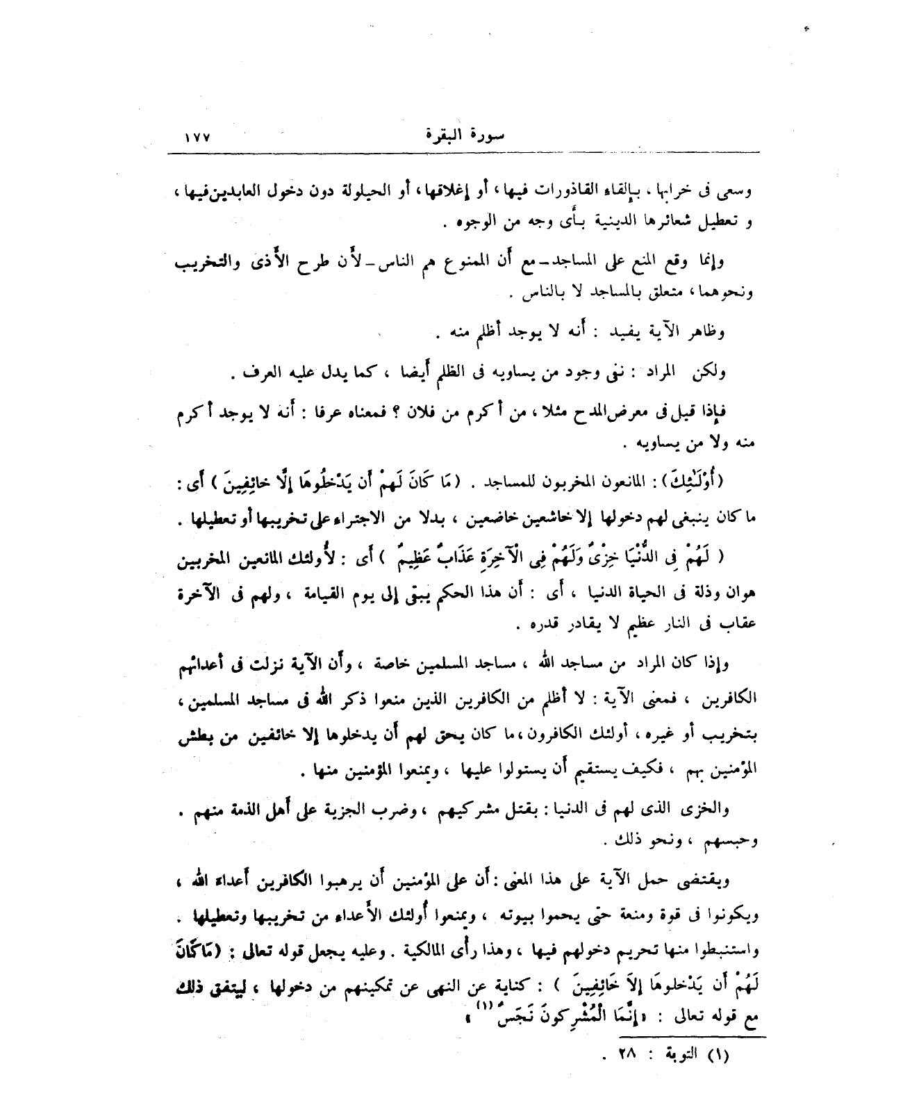 واستنبطوا منها تحريم دخولهم فيها، وهذا رأي المالكية. وعليه يجعل قوله تعالى: {مَا كَانَ لَهُمْ أَنْ يَدْخُلُوهَا إِلَّا خَائِفِينَ}: كناية عن النهي عن تمكينهم من دخولها، ليتفق ذلك مع قوله تعالى: {إِنَّمَا الْمُشْرِكُونَ نَجَسٌ} (¬1)