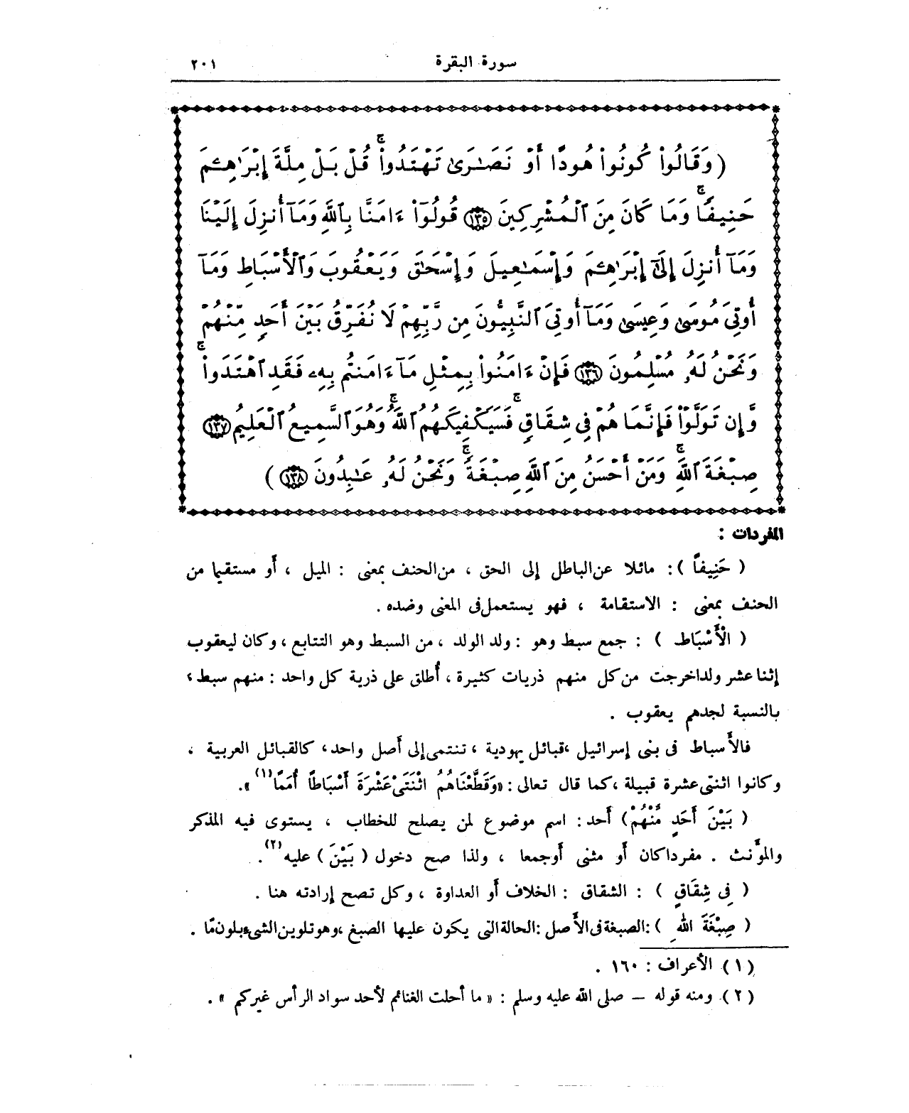 {وَقَالُوا كُونُوا هُودًا أَوْ نَصَارَى تَهْتَدُوا قُلْ بَلْ مِلَّةَ إِبْرَاهِيمَ حَنِيفًا وَمَا كَانَ مِنَ الْمُشْرِكِينَ (135) قُولُوا آمَنَّا بِاللَّهِ وَمَا أُنْزِلَ إِلَيْنَا وَمَا أُنْزِلَ إِلَى إِبْرَاهِيمَ وَإِسْمَاعِيلَ وَإِسْحَاقَ وَيَعْقُوبَ وَالْأَسْبَاطِ وَمَا أُوتِيَ مُوسَى وَعِيسَى وَمَا أُوتِيَ النَّبِيُّونَ مِنْ رَبِّهِمْ لَا نُفَرِّقُ بَيْنَ أَحَدٍ مِنْهُمْ وَنَحْنُ لَهُ مُسْلِمُونَ (136) فَإِنْ آمَنُوا بِمِثْلِ مَا آمَنْتُمْ بِهِ فَقَدِ اهْتَدَوْا وَإِنْ تَوَلَّوْا فَإِنَّمَا هُمْ فِي شِقَاقٍ فَسَيَكْفِيكَهُمُ اللَّهُ وَهُوَ السَّمِيعُ الْعَلِيمُ (137) صِبْغَةَ اللَّهِ وَمَنْ أَحْسَنُ مِنَ اللَّهِ صِبْغَةً وَنَحْنُ لَهُ عَابِدُونَ (138)}