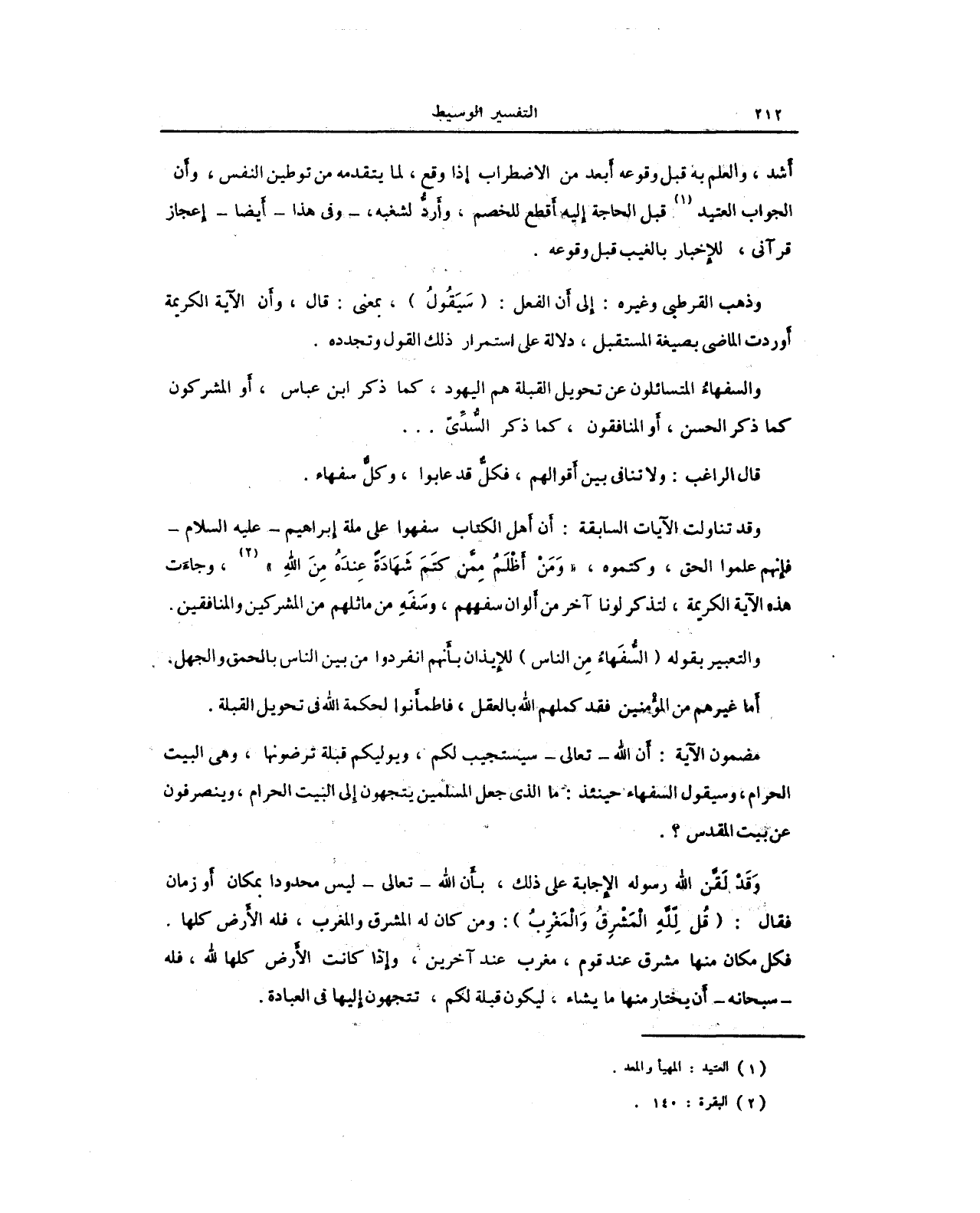 والسفهاءُ المتسائلون عن تحويل القبلة هم اليهود، كما ذكر ابن عباس، أو المشركون كما ذكر الحسن، أو المنافقون، كما ذكر السُّدِّيّ ..