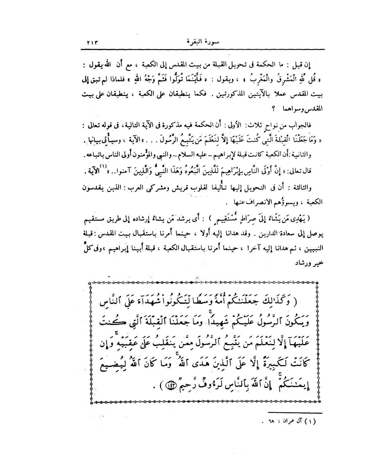 {وَكَذَلِكَ جَعَلْنَاكُمْ أُمَّةً وَسَطًا لِتَكُونُوا شُهَدَاءَ عَلَى النَّاسِ وَيَكُونَ الرَّسُولُ عَلَيْكُمْ شَهِيدًا وَمَا جَعَلْنَا الْقِبْلَةَ الَّتِي كُنْتَ عَلَيْهَا إِلَّا لِنَعْلَمَ مَنْ يَتَّبِعُ الرَّسُولَ مِمَّنْ يَنْقَلِبُ عَلَى عَقِبَيْهِ وَإِنْ كَانَتْ لَكَبِيرَةً إِلَّا عَلَى الَّذِينَ هَدَى اللَّهُ وَمَا كَانَ اللَّهُ لِيُضِيعَ إِيمَانَكُمْ إِنَّ اللَّهَ بِالنَّاسِ لَرَءُوفٌ رَحِيمٌ (143)}