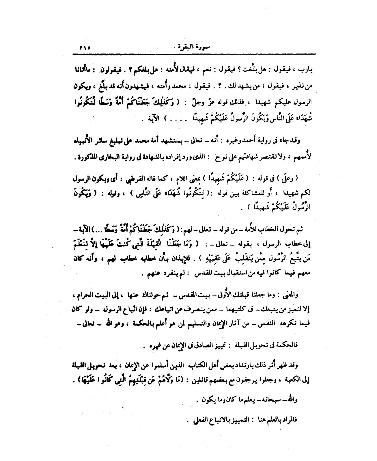 ثم تحول الخطاب للأمة - من قوله - تعالى - لهم: {وَكَذَلِكَ جَعَلْنَاكُمْ أُمَّةً وَسَطًا ... } الآية - إلى خطاب الرسول، بقوله - تعالى -: {وَمَا جَعَلْنَا الْقِبْلَةَ الَّتِي كُنْتَ عَلَيْهَا إِلَّا لِنَعْلَمَ مَنْ يَتَّبِعُ الرَّسُولَ مِمَّنْ يَنْقَلِبُ عَلَى عَقِبَيْهِ}. للإيذان بأن خطابه خطاب لهم، وأنه كان معهم فيما كانوا فيه من استقبال بيت المقدس: لم ينفرد عنهم.