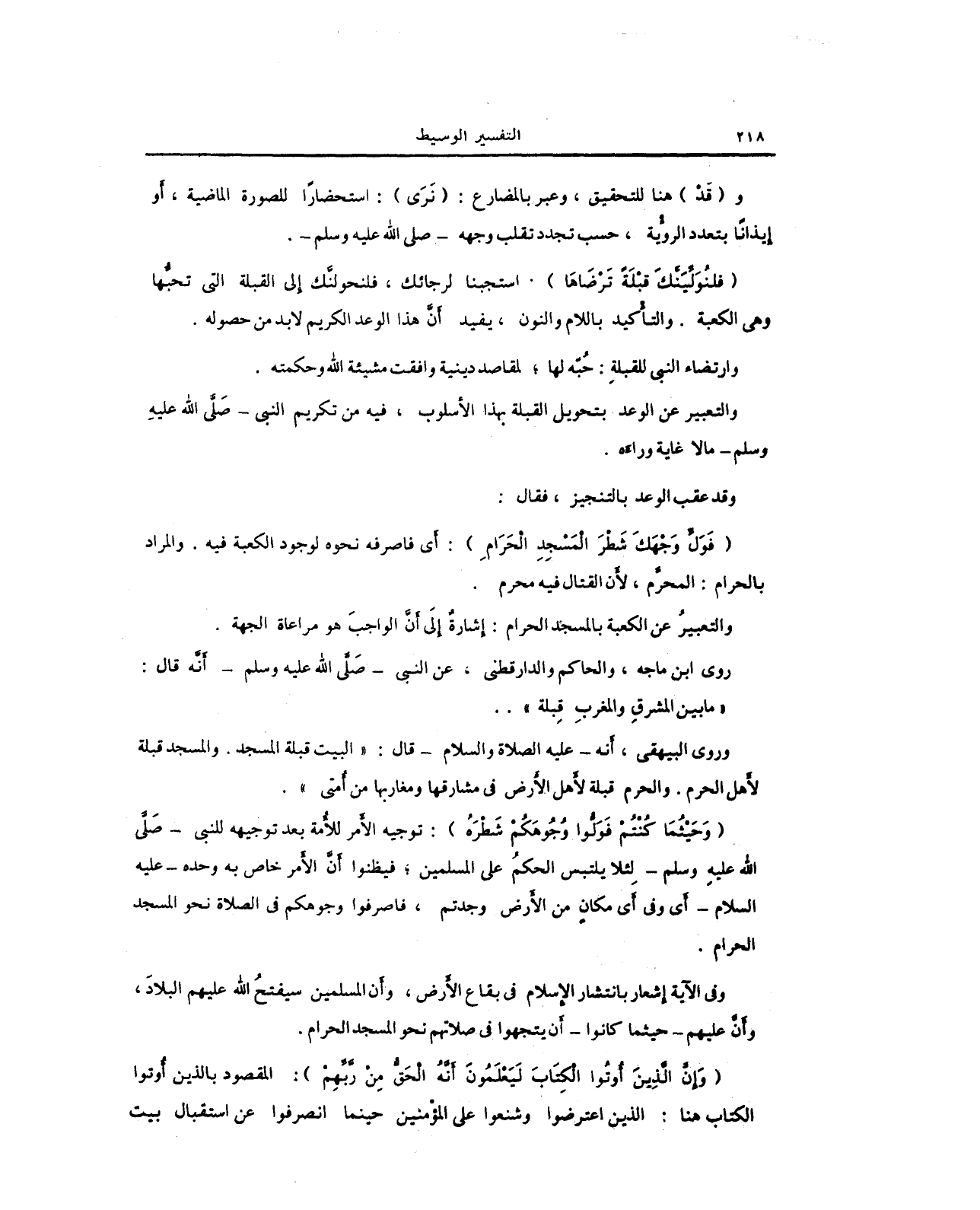 وروى البيهقي، أنه - عليه الصلاة والسلام - قال: "البيت قبلة المسجد. والمسجد قبلة لأهل الحرم. والحرم قبلة لأهل الأرض في مشارقها ومغاربها من أُمتي).
