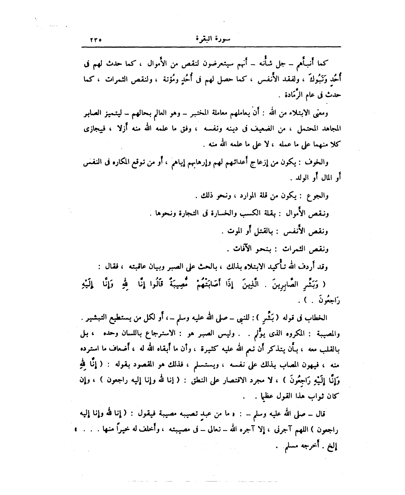 والمصيبة: المكروه الذي يؤلم. وليس الصبر هو: الاسترجاع باللسان وحده، بل بالقلب معه، بأن يتذكر أن نعم الله عليه كثيرة، وأن ما أبقاه الله له، أضعاف ما استرده منه، فيهون المصاب بذلك على نفسه، ويستسلم، فذلك هو المقصود بقوله: {إِنَّا لِلَّهِ وَإِنَّا إِلَيْهِ رَاجِعُونَ}، لا مجرد الاقتصار على النطق: {إِنَّا لِلَّهِ وَإِنَّا إِلَيْهِ رَاجِعُونَ}، وإن كان ثواب هذا القول عظيمًا.