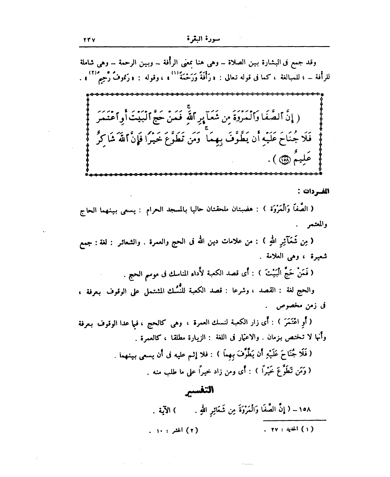 {الصَّفَا وَالْمَرْوَةَ}: هضبتان ملحقتان حاليًا بالمسجد الحرام: يسعى بينهما الحاج والمعتمر.