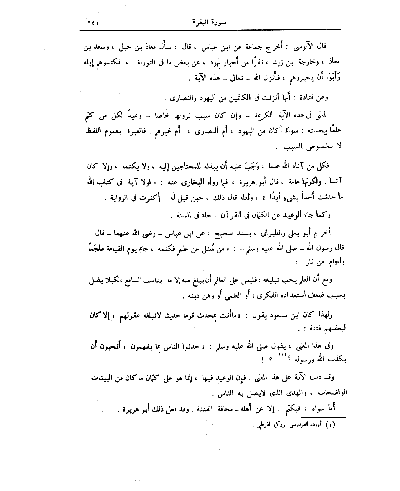المعنى في هذه الآية الكريمة - وإن كان سبب نزولها خاصًا - وعيدٌ لكل من كتم علمًا يحسنه: سواءٌ أكان من اليهود، أم النصارى، أم غيرهم. فالعبرة بعموم اللفظ لا بخصوص السبب.