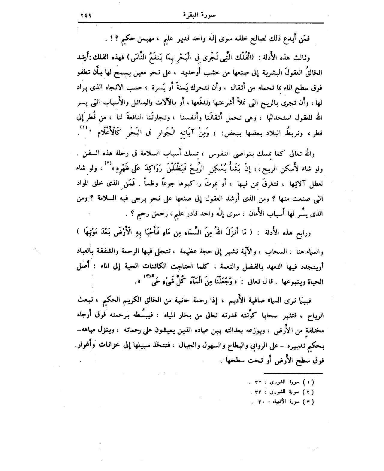 والله تعالى كما يمسك بنواصي النفوس، يمسك أسباب السلامة في رحلة هذه السفن. ولو شاء لأسكن الريح، {إِنْ يَشَأْ يُسْكِنِ الرِّيحَ فَيَظْلَلْنَ رَوَاكِدَ عَلَى ظَهْرِهِ} (¬2)، ولو شاء لعطل آلاتها، فتغرق بمن فيها، أو يموت راكبوها جوعًا وظمأ. فمن الذي خلق المواد التي صُنعت منها؟ ومن الذي أرشد العقول إلى صنعها على نحو يُرجى فيه السلامة؟ ومن الذي يسَّر لها أسباب الأمان، سوى إله واحد قادر عليم، رحمن رحيم؟
