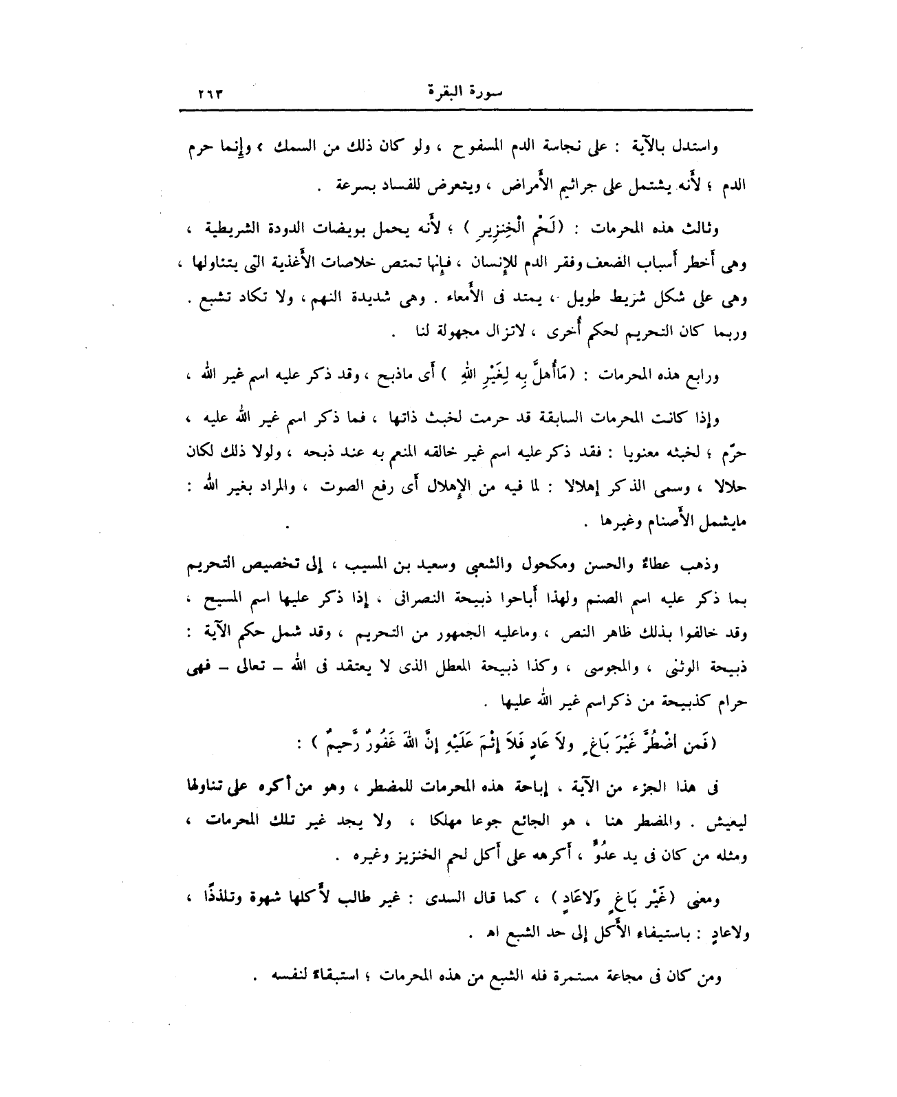 ومعنى {غَيْرَ بَاغٍ وَلَا عَادٍ}، كما قال السدي: غير طالب لأكلها شهوة وتلذذًا، ولا عادٍ: باستيفاء الأَكل إلى حد الشبع اهـ.