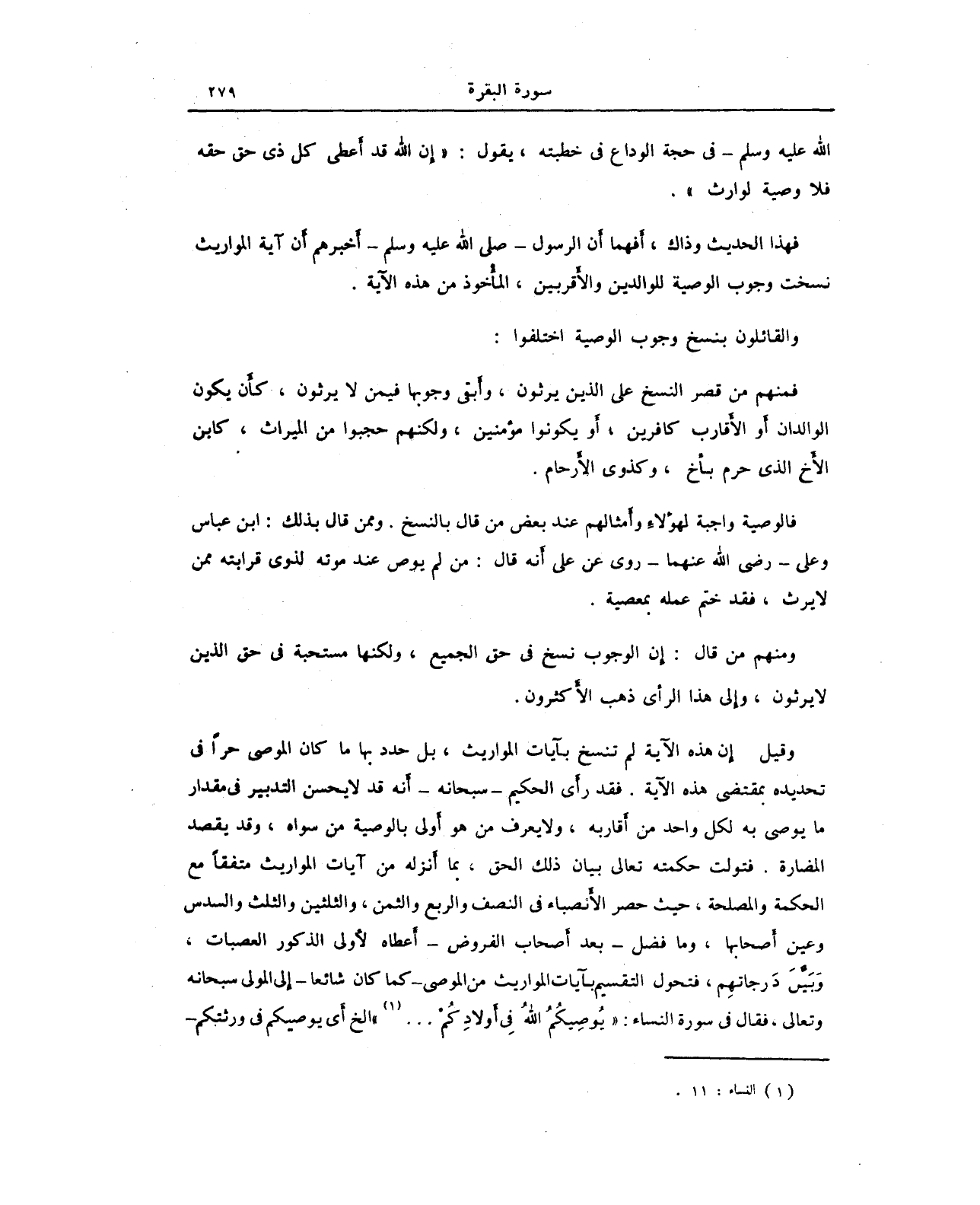 وقيل إن هذه الآية لم تُنسخ بآيات المواريث، بل حدد بها ما كان الموصى حرًا في تحديده بمقتضى هذه الآية. فقد رأى الحكيم - سبحانه - أنه قد لا يحسن التدبير في مقدار ما يوصي به لكل واحد من أقاربه، ولا يعرف من هو أولى بالوصية من سواه، وقد يقصد المضارة. فتولت حكمته تعالى بيان ذلك الحق، بما أنزله من آيات المواريث متفقًا مع الحكمة والمصلحة، حيث حصر الأنصباء في النصف والربع والثمن، والثلثين والثلث والسدس وعين أصحابها، وما فضل - بعد أصحاب الفروض - أعطاه لأولي الذكور العصبات، وَبَيَّنَ دَرجاتهِم، فتحول التقسيم بآيات المواريث من الموصي - كما كان شائعًا - إلى المولى سبحانه وتعالى، فقال في سورة النساء: {يُوصِيكُمُ اللَّهُ فِي أَوْلَادِكُمْ ... } (¬1) الخ أي يوصيكم في ورثتكم -