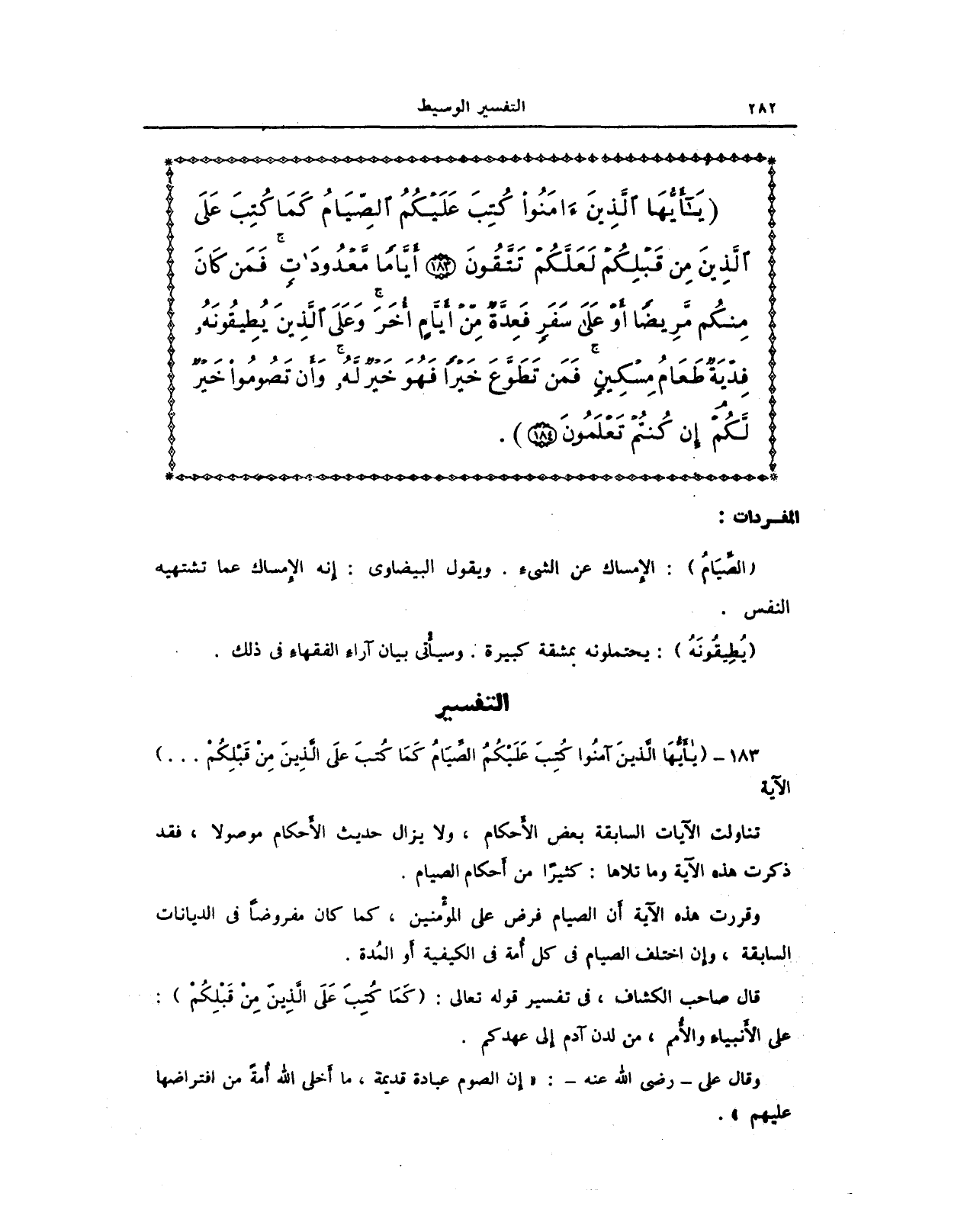 وقررت هذه الآية أن الصيام فرض على المؤمنين، كما كان مفروضًا في الديانات السابقة، وإن اختلف الصيام في كل أُمة في الكيفية أو المُدة.
