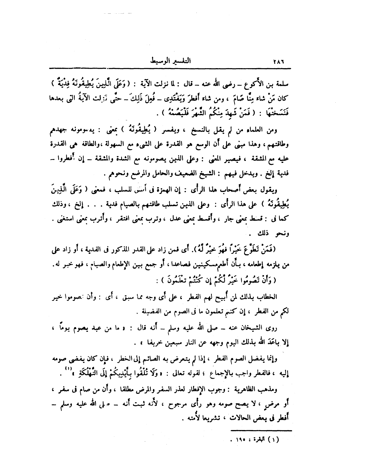 سلمة بن الأكوع - رضي الله عنه - قال: لما نزلت الآية: {وَعَلَى الَّذِينَ يُطِيقُونَهُ فِدْيَةٌ} كان مَنْ شاءَ مِنَّا صَامَ، ومن شاءَ أَفطرَ وَيَفْتَدِي - فُعِلَ ذَلِكَ - حتى نزلت الآيةُ التي بعدها فَنَسَختْهَا: {فَمَن شَهِدَ مِنكُمُ الشَّهْرَ فَلْيَصُمْهُ}.