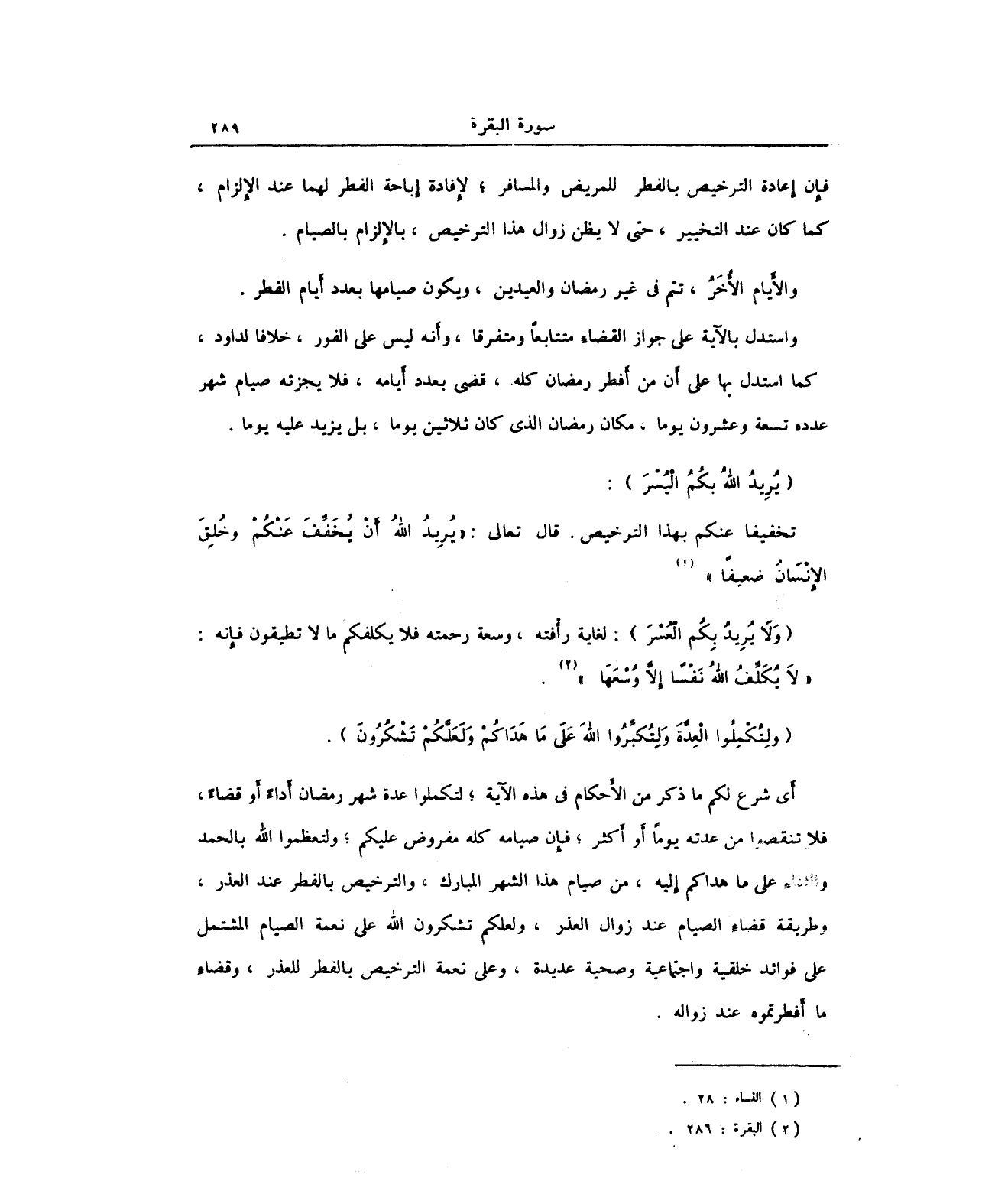{وَلَا يُرِيدُ بِكُمُ الْعُسْرَ}: لغاية رأفته، وسعة رحمته فلا يُكلفكم ما لا تطيقون فإنه: "لَا يُكَلِّفُ اللَّهُ نَفْسًا إِلَّا وُسْعَهَا" (¬2).