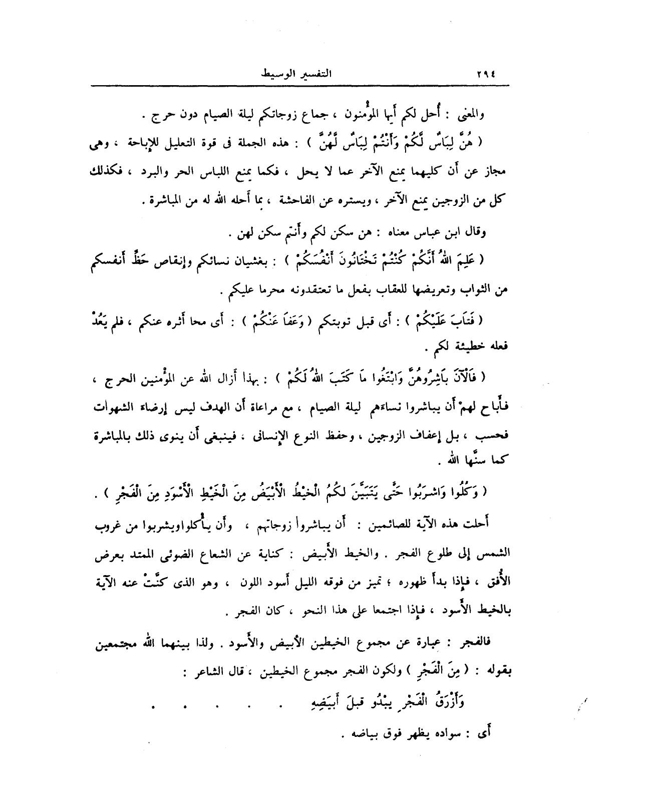 أحلت هذه الآية للصائمين: أن يباشروا زوجاتهم، وأن يأكلوا ويشربوا عن غروب الشمس إلى طلوع الفجر. والخيط الأبيض: كناية عن الشعاع الضوئي الممتد بعرض الأُفق، فإذا بدأ ظهوره، تميز من فوقه الليل أسود اللون، وهو الذي كنَّتْ عنه الآية بالخيط الأسود، فإذا اجتمعا على هذا النحو، كان الفجر.