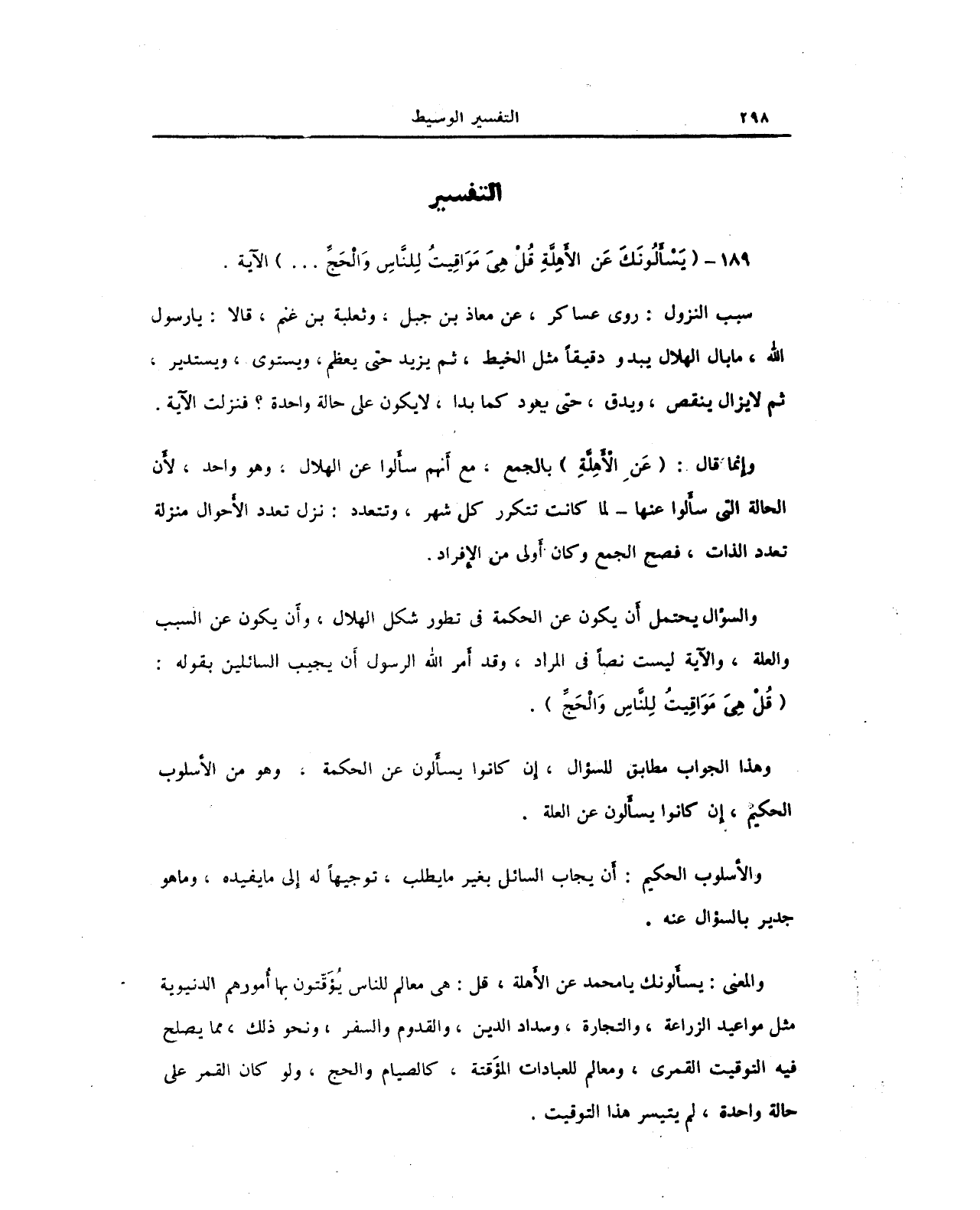 والسؤال يحتمل أن يكون عن الحكمة في تطور شكل الهلال، وأن يكون عن السبب والعلة، والآية ليست نصًا في المراد، وقد أمر الله الرسول أن يجيب السائلين بقوله: {قُلْ هِيَ مَوَاقِيتُ لِلنَّاسِ وَالْحَجِّ}.