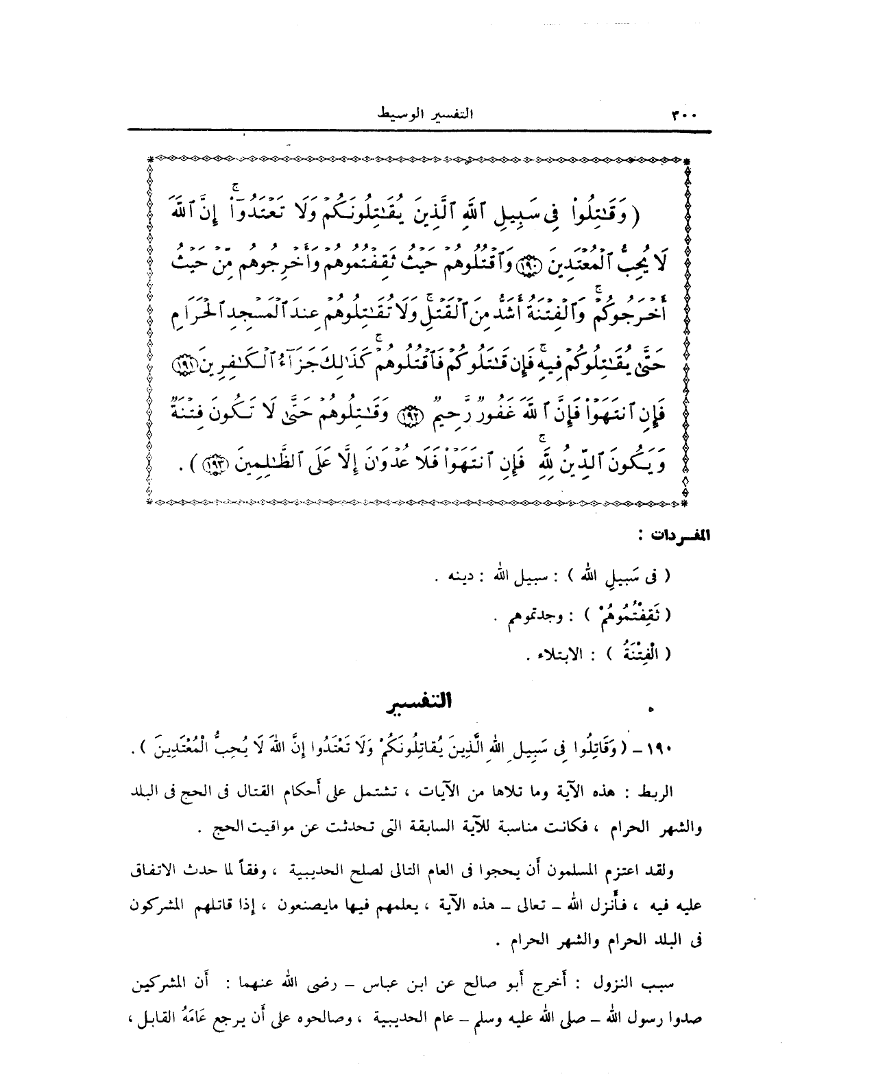 ولقد اعتزم المسلمون أن يحجوا في العام التالي لصلح الحديبية، وفقًا لما حدث الاتفاق عليه فيه، فأَنزل الله - تعالى - هذه الآية، يعلمهم فيها ما يصنعون، إذا قاتلهم المشركون في البلد الحرام والشهر الحرام.